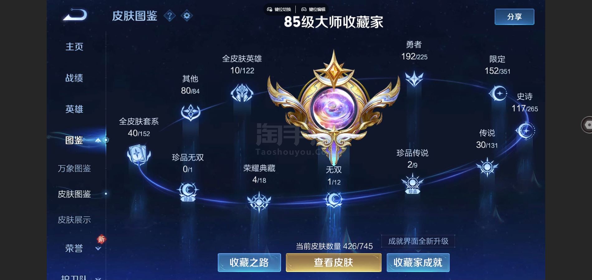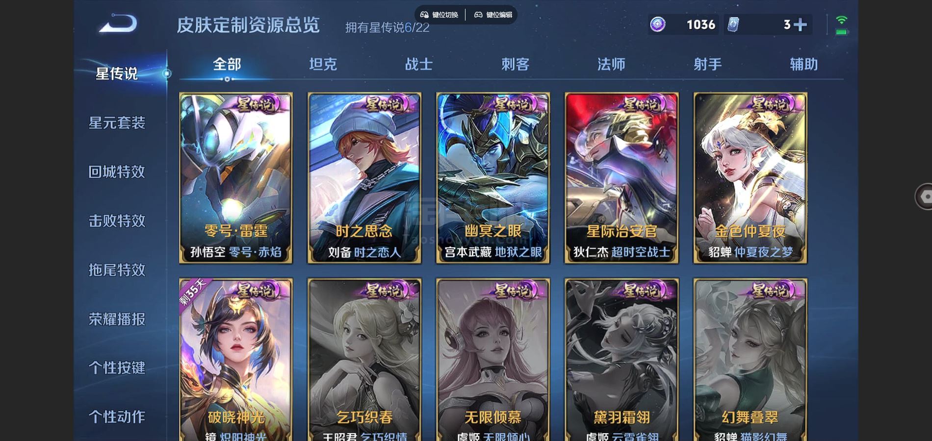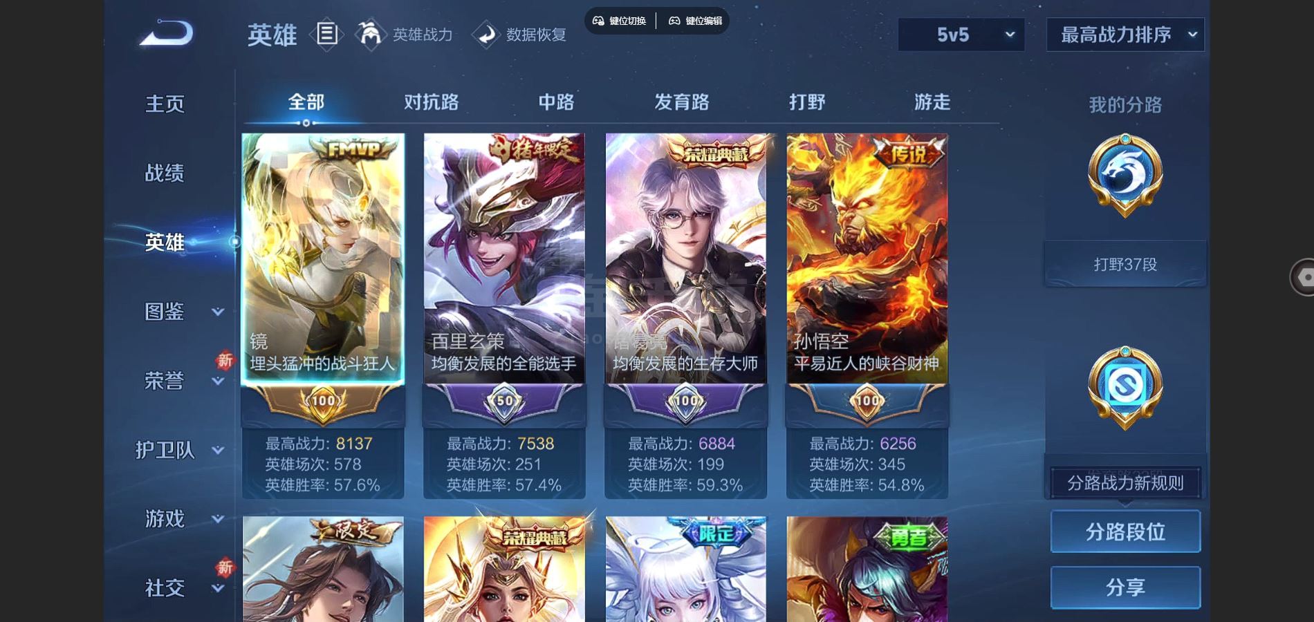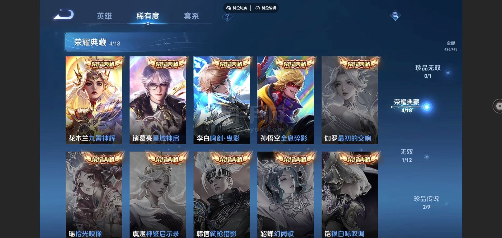 V9-426皮肤4典藏1无双2珍品传说30传说 打野37段 金标镜 6星传说零号雷霆 时之思念 幽冥