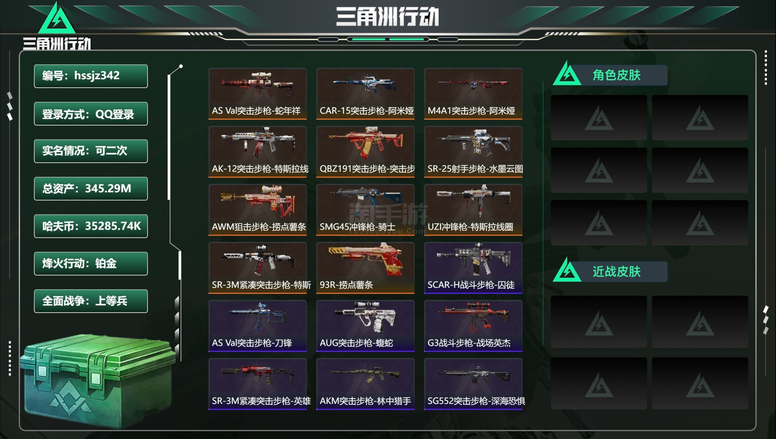 总资产345.29M,哈夫币 35285.74K,战场等级:34 上等兵,行动等级:60 铂金,角色