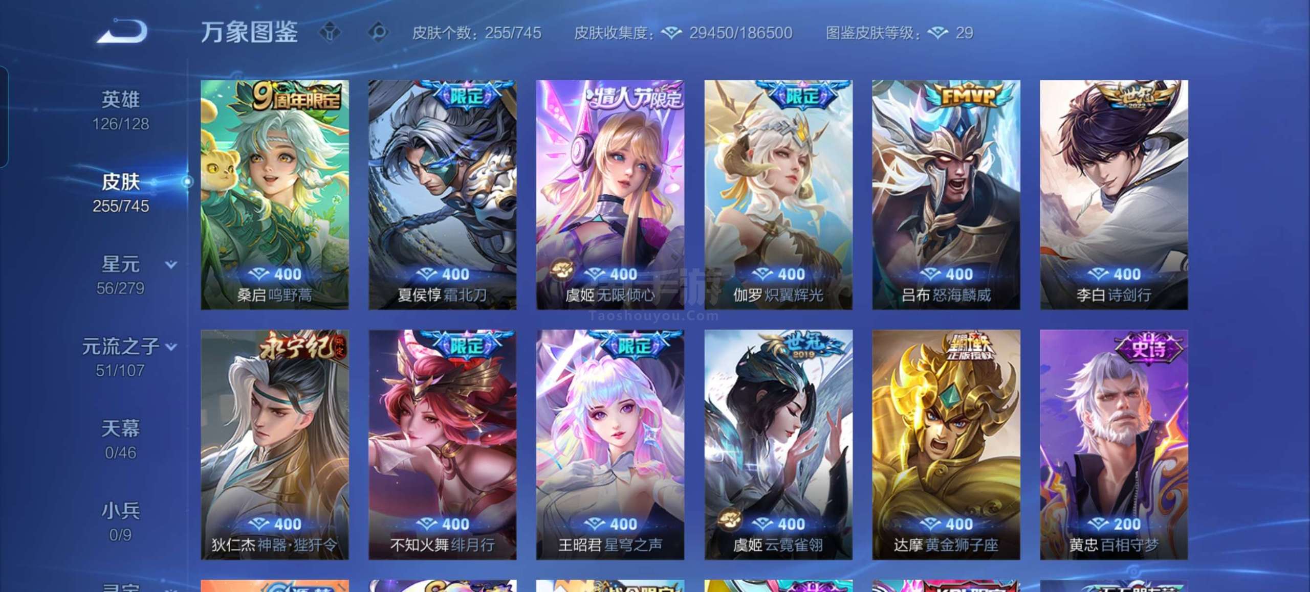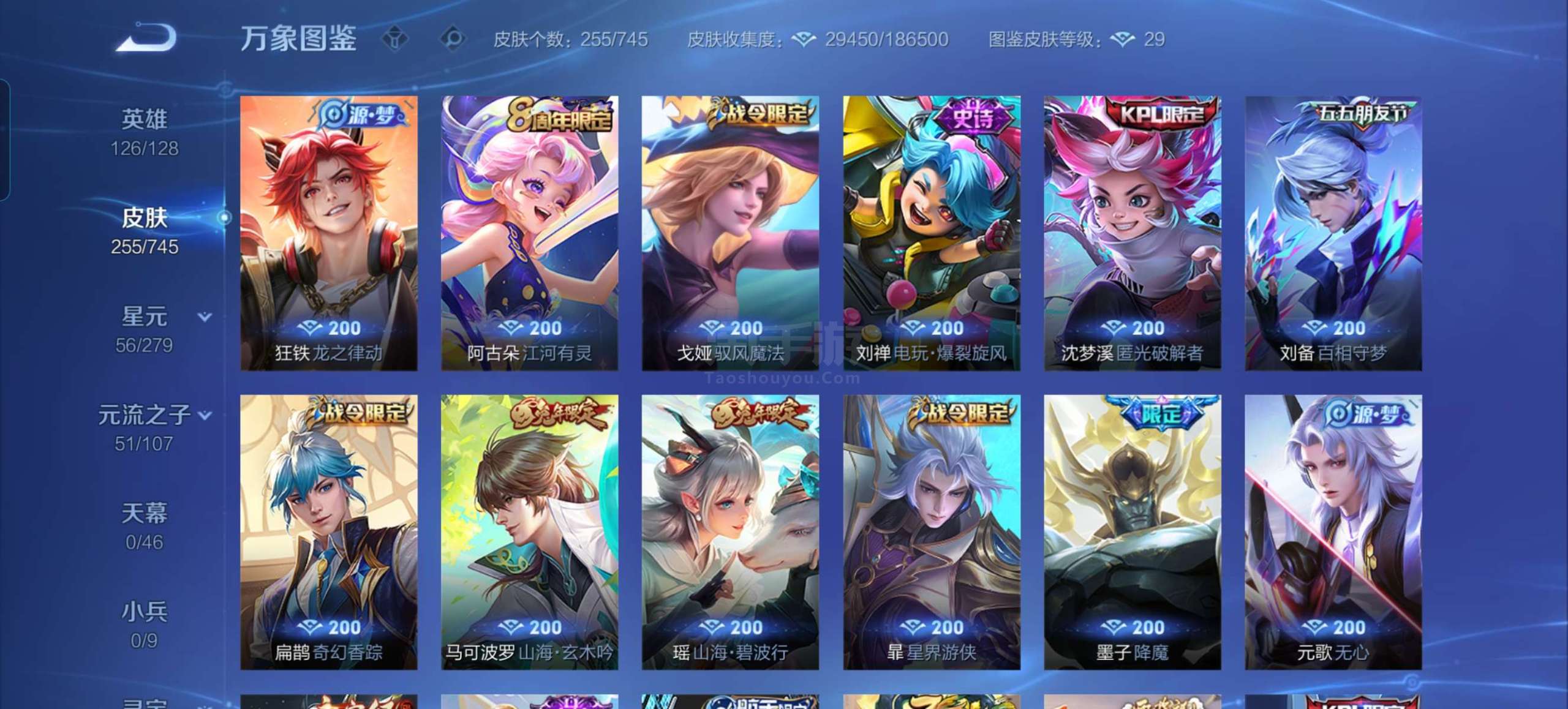 十一传说64限定。48史诗。英雄126皮肤255贵族7