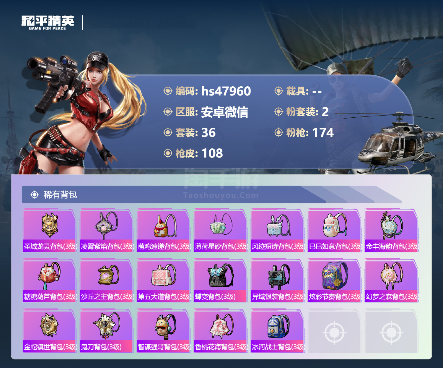 hs47960 安卓微-3王牌印记-2粉装-5特效枪-27895热力值-36套装-108枪皮 【2