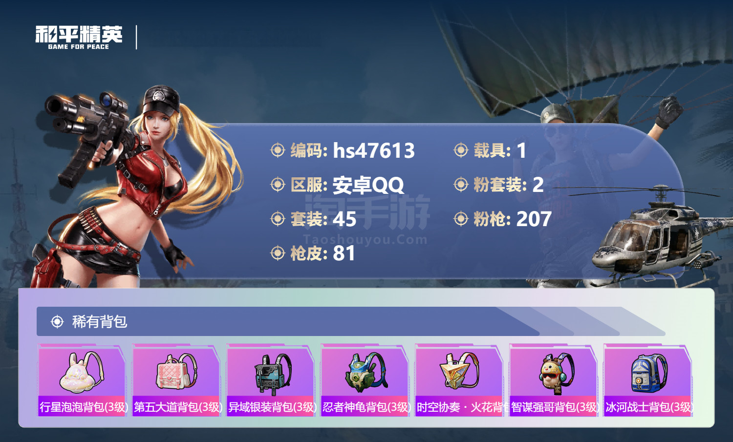 安卓手Q-2王牌印记-2粉装-4特效枪-1载具-27694热力值-45套装-81枪皮-1卓越印记 【