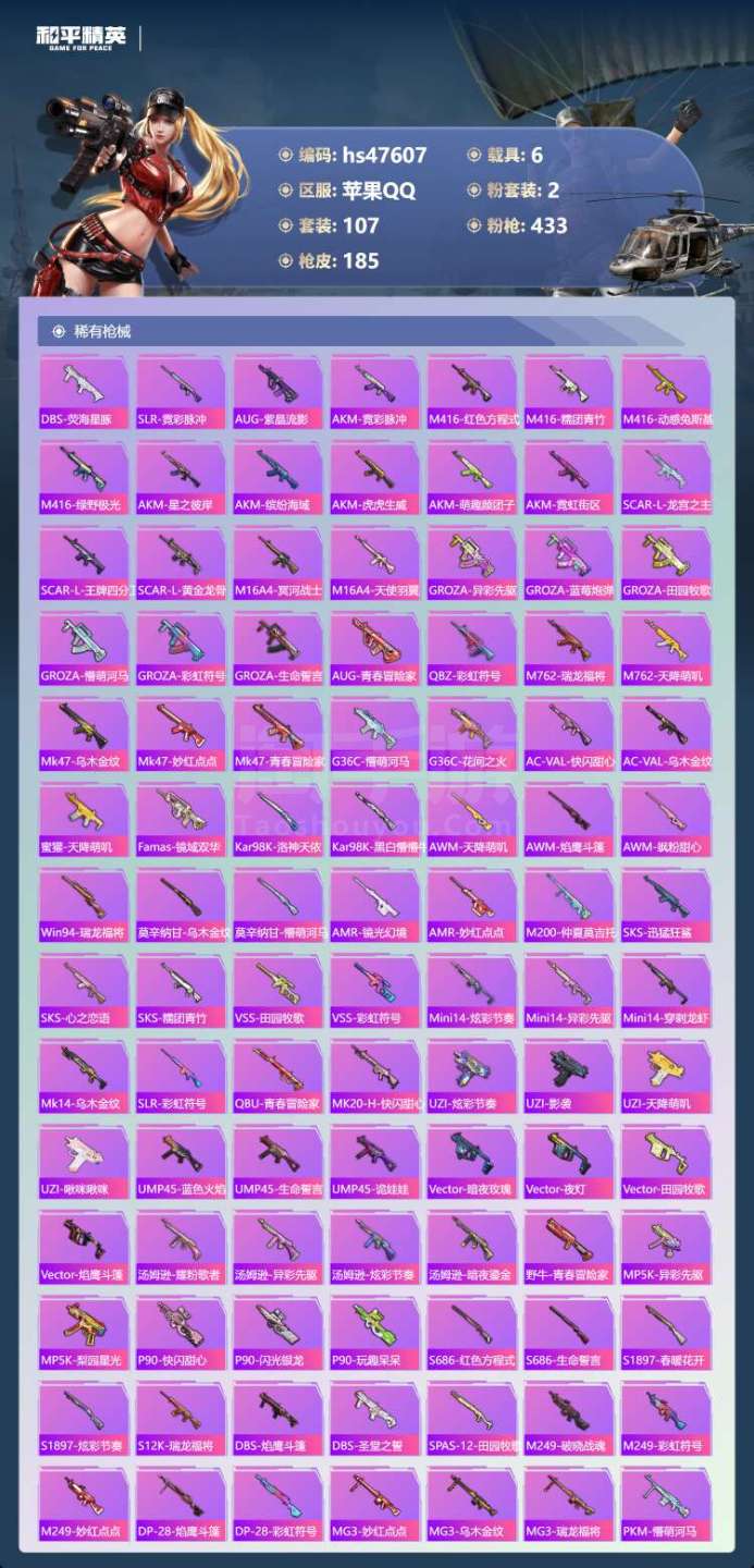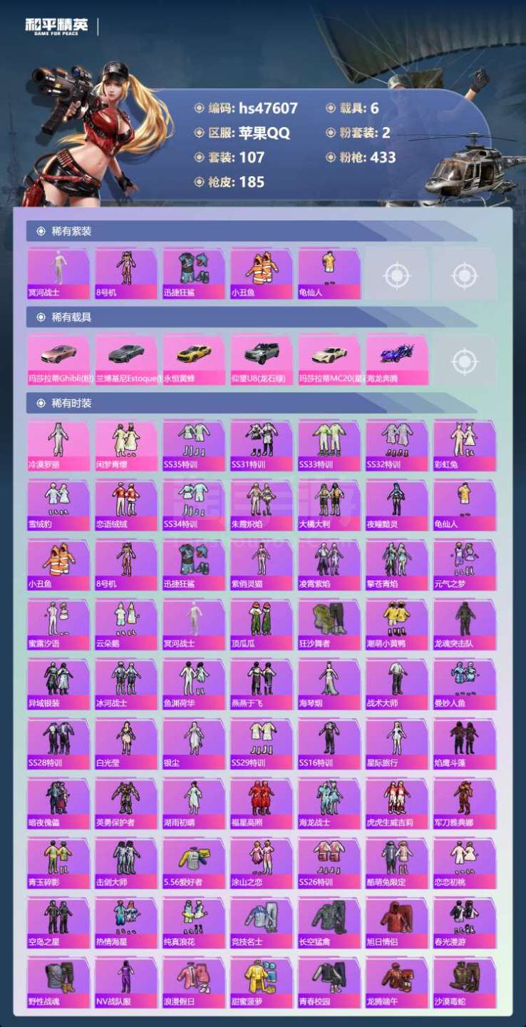 苹果手Q-9王牌印记-有战神框-2粉装-8特效枪-6载具-64975热力值-107套装-185枪皮-