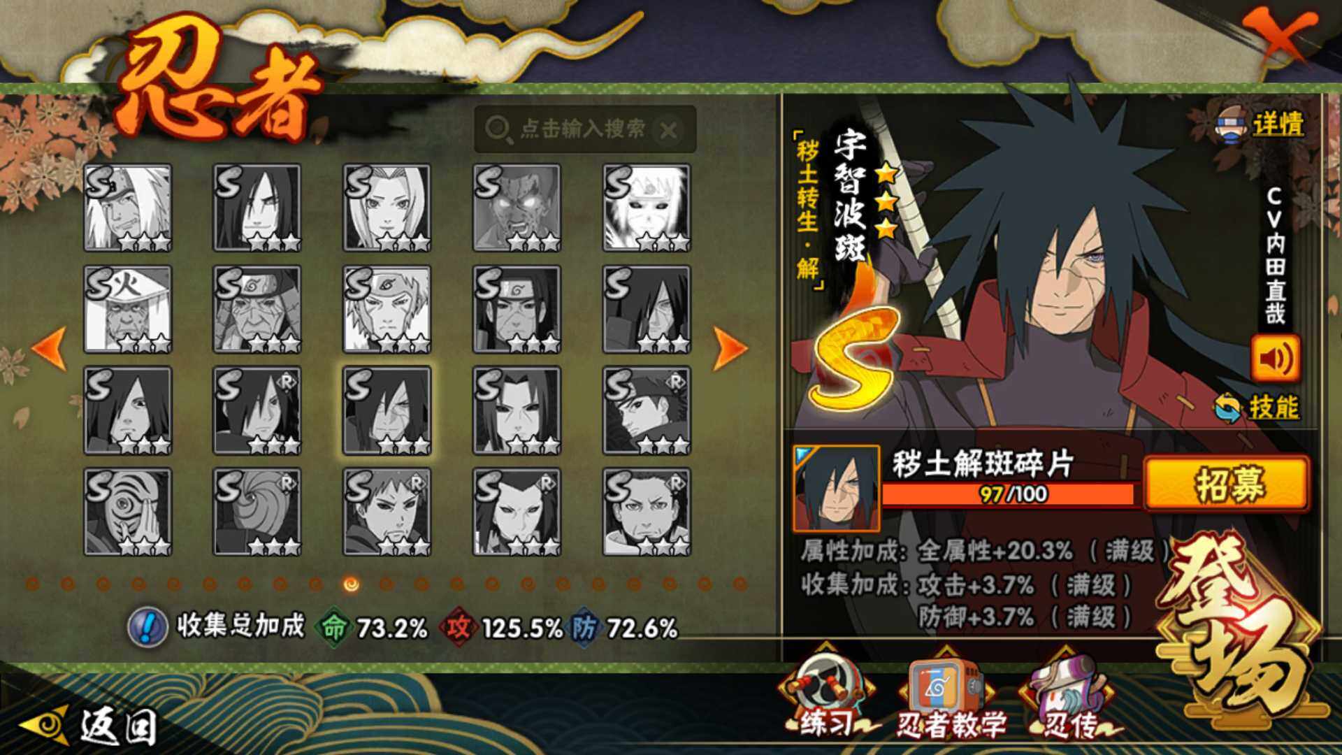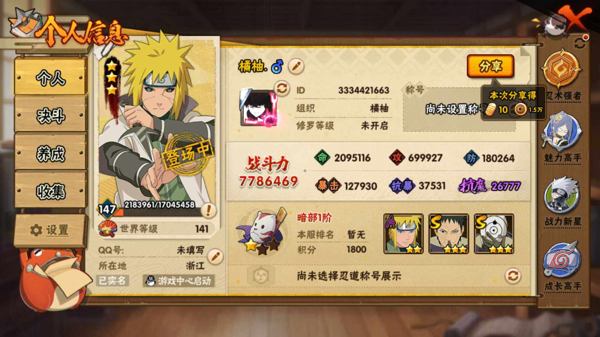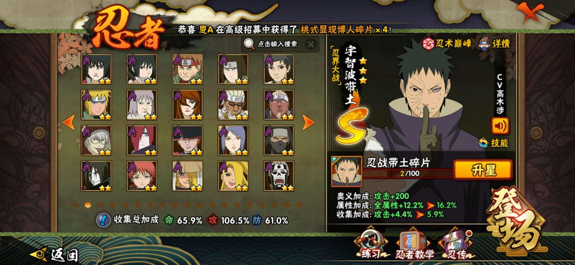 V11/778万战力/总忍者175/18S/34A/红夜带土/创立柱间/无/秽土半藏/大筒木金氏/百豪纲手/白面具/忍战带土/秽土水门/秽土扉间/永恒佐助/忍战樱/千手柱间/仙人兜/侠隐纲手/漂泊小南/卑留呼/18通灵/47密卷/1.5千金币/秽土解斑97片/忍战大野木52片