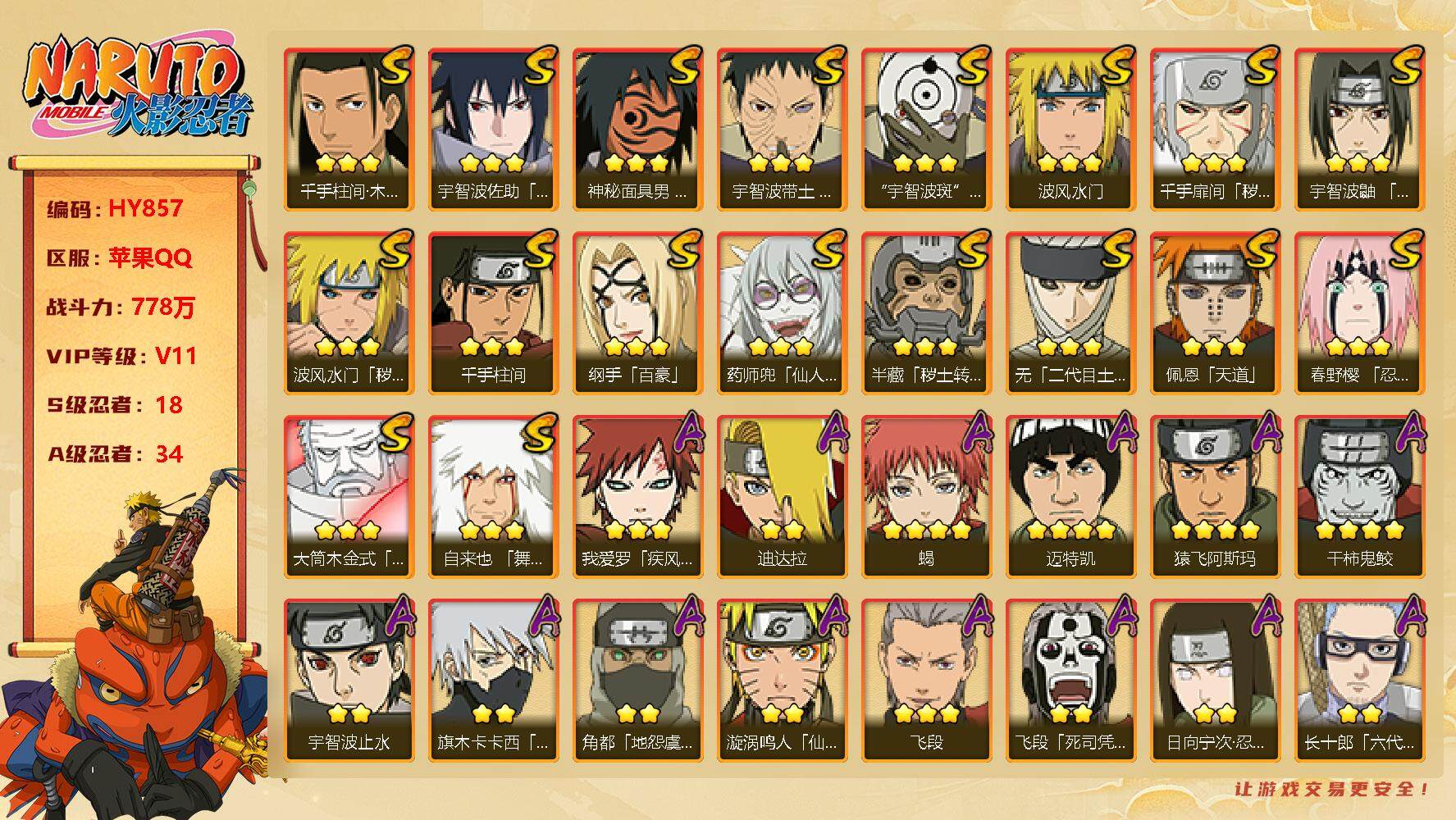 火影忍者【苹果QQ】V11/778万战力/总忍者175/18S/34A/红夜带土/创立柱间/无/秽