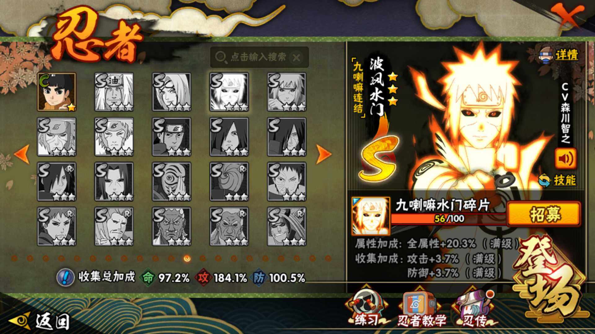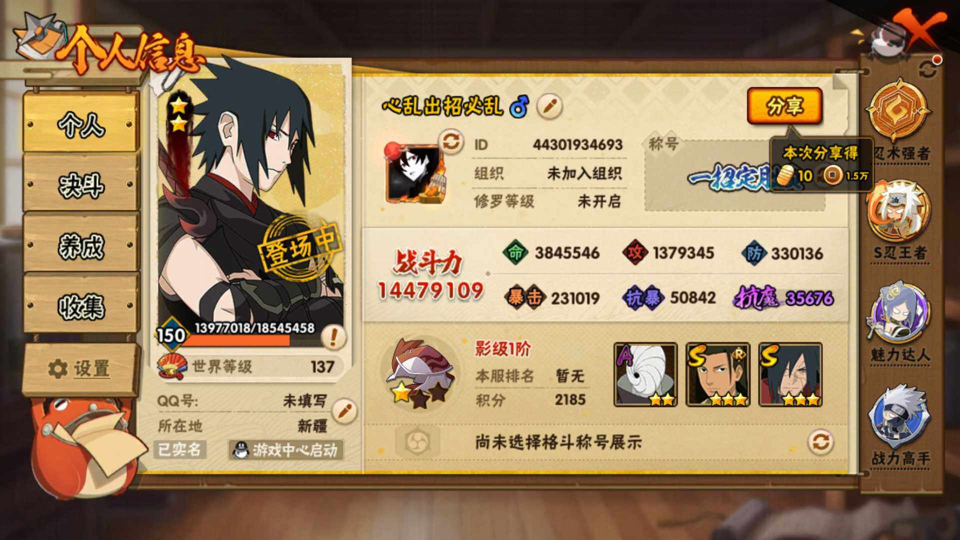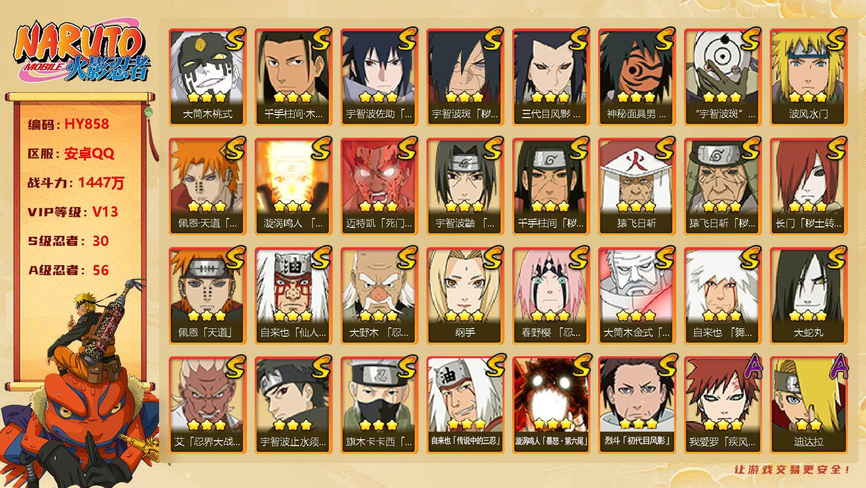V13/1447万战力/总忍者221/30S/56A/16个付费A/暴怒六尾/天道超/红夜带土/须佐止水/创立柱间/大筒木桃式/大筒木金氏/烈斗/三代风影/须佐卡卡西/传说自来也/白面具/忍战艾/忍战大野木/忍战樱/秽土柱间/秽土解斑/秽土长门/秽土日斩/侠隐佐助/侠隐大野木/侠隐纲手/侠隐兜/侠隐照美冥/机械鸣人/忍者之路面麻/新春止水/新春我爱罗/漂泊再不斩/漂泊扉间/漂泊六道/漂泊小南/漂