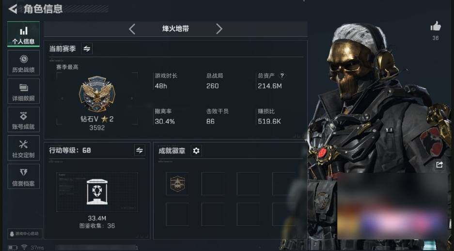 【个人信息】战场等级:1 无军衔,行动等级:60 钻石