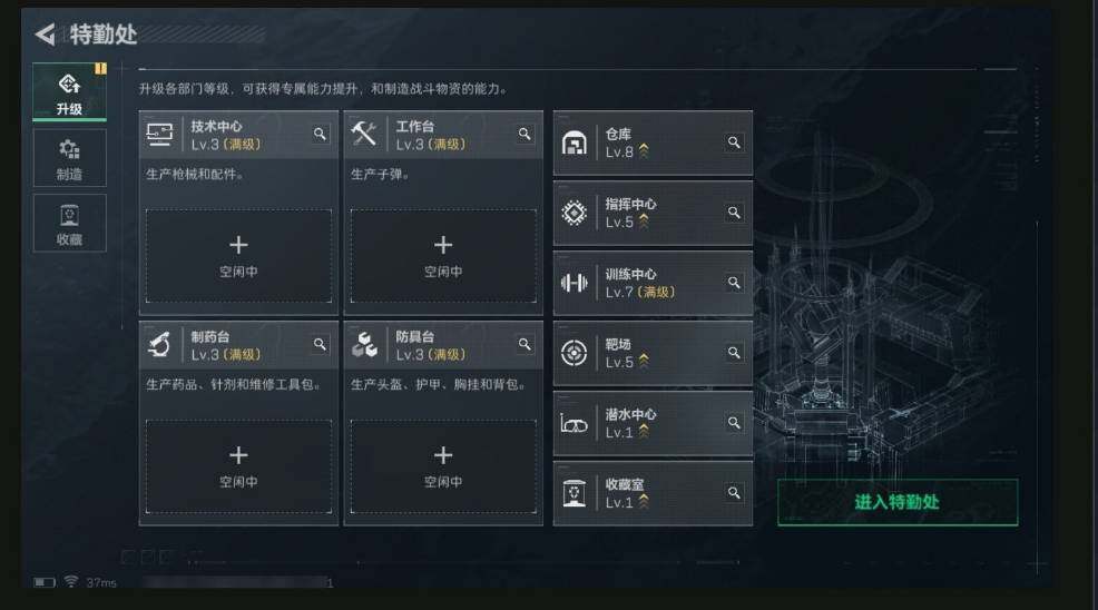 【特勤处】制药台Lv.3/工作台Lv.3/仓库Lv.8/防具台Lv.3/训练中心Lv.7/靶场Lv.5/技