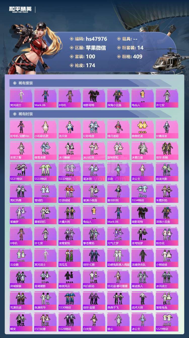 hs47976 苹果v-11王牌印记-14粉装-15特效枪-59138热力值-100套装-174枪
