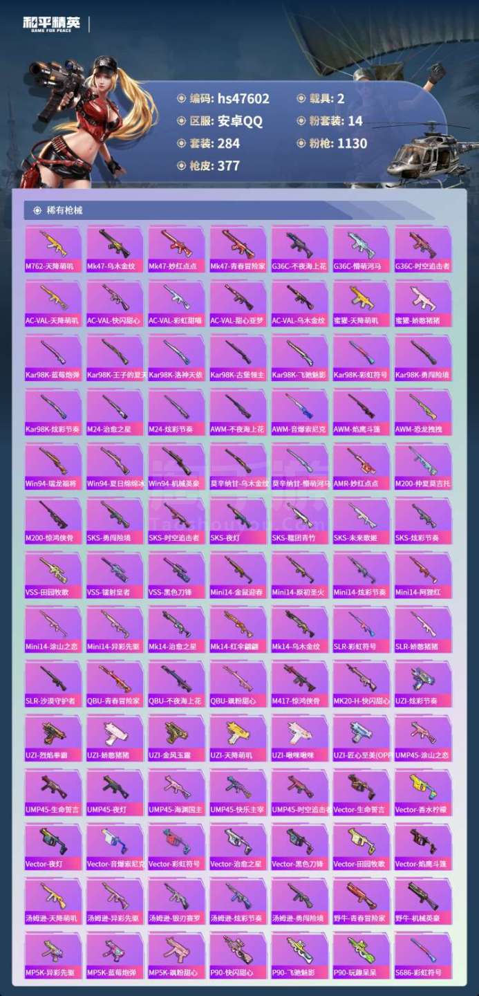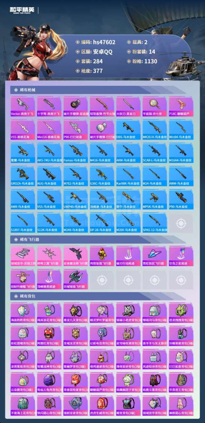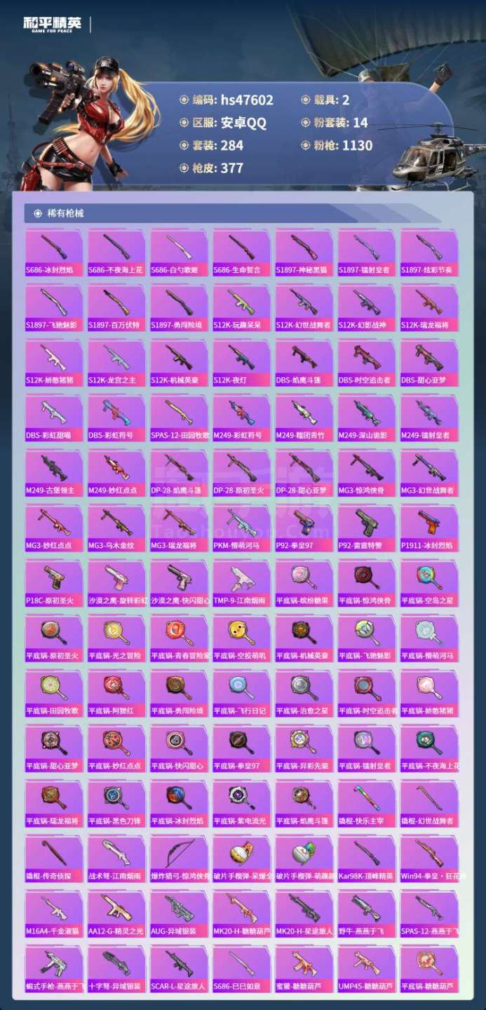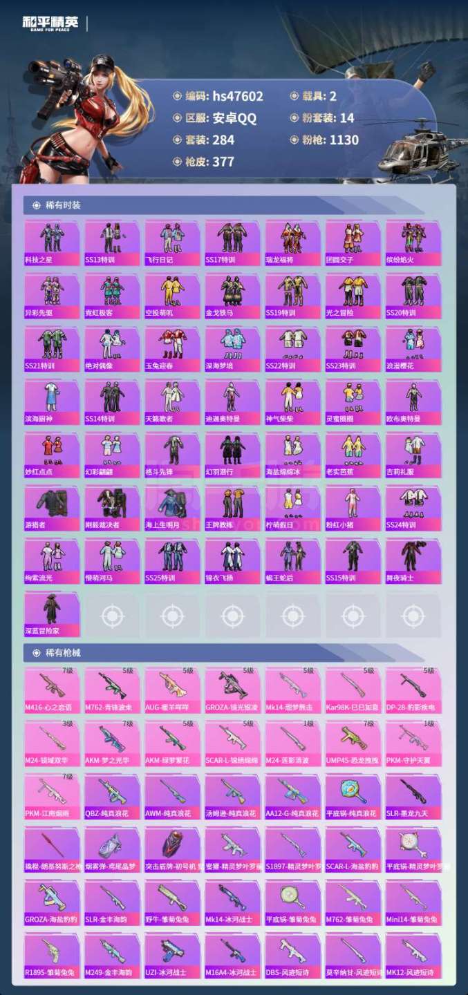 hs47602 安卓手Q-20王牌印记-14粉装-15特效枪-2载具-131707热力值-284套装
