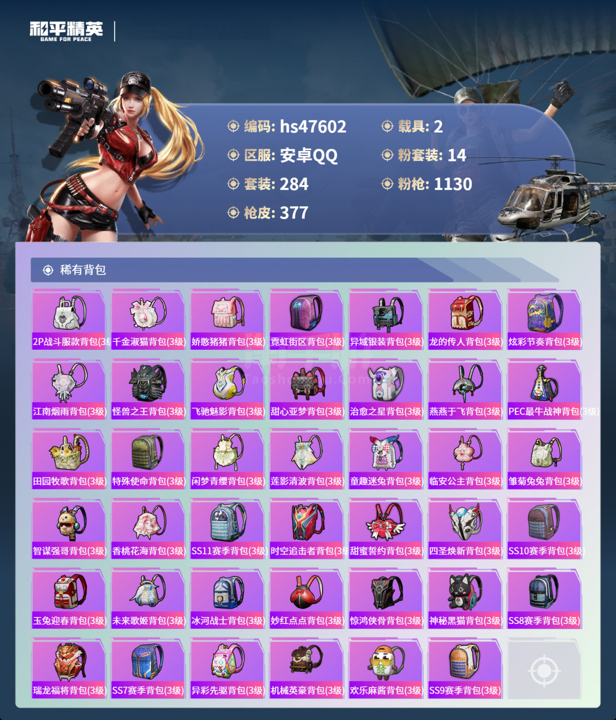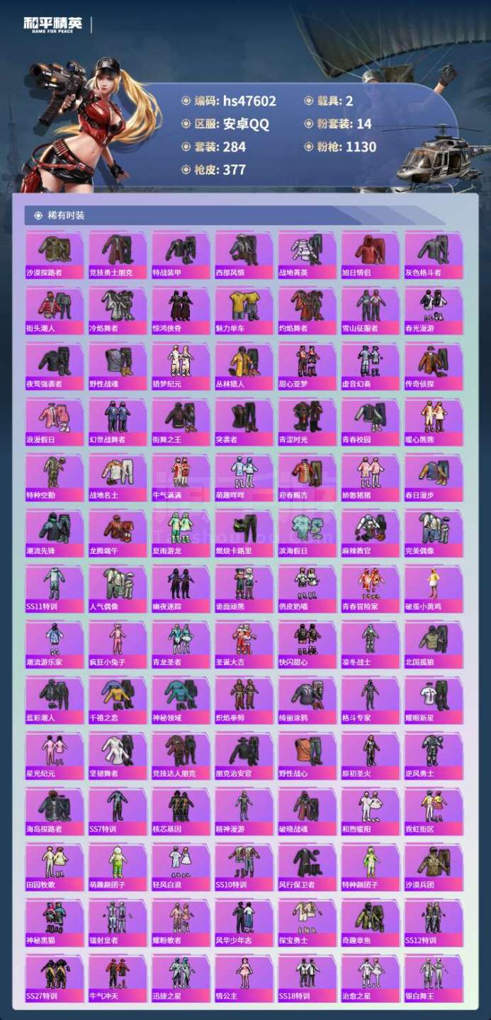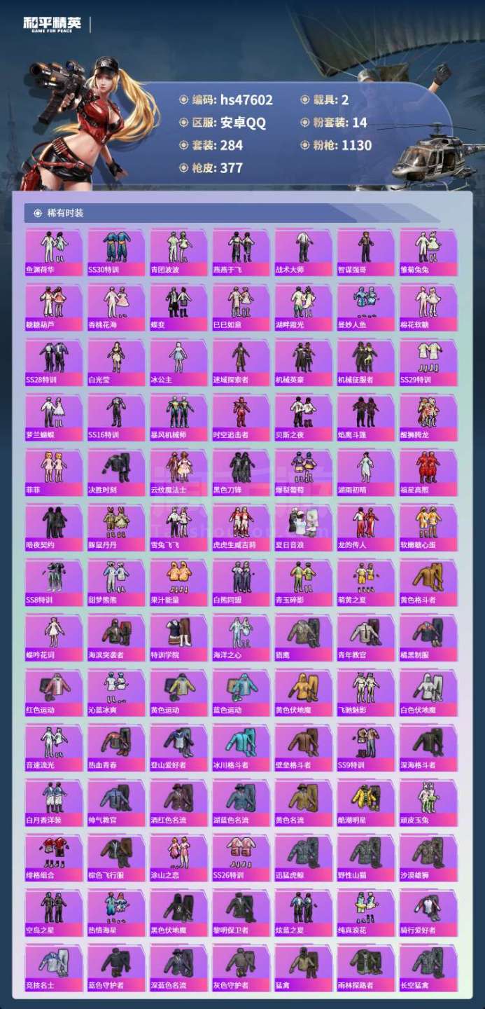 hs47602 安卓手Q-20王牌印记-14粉装-15特效枪-2载具-131707热力值-284套装