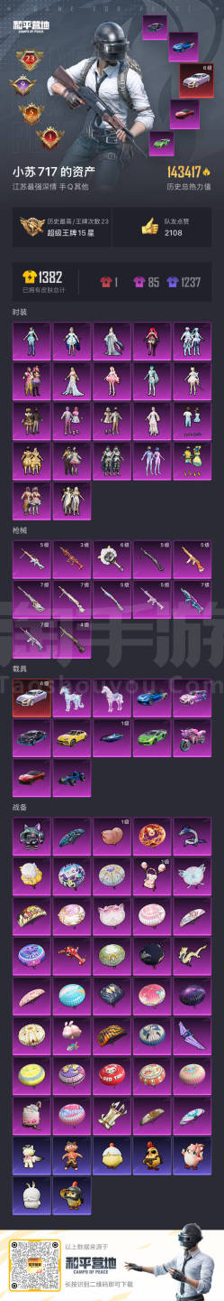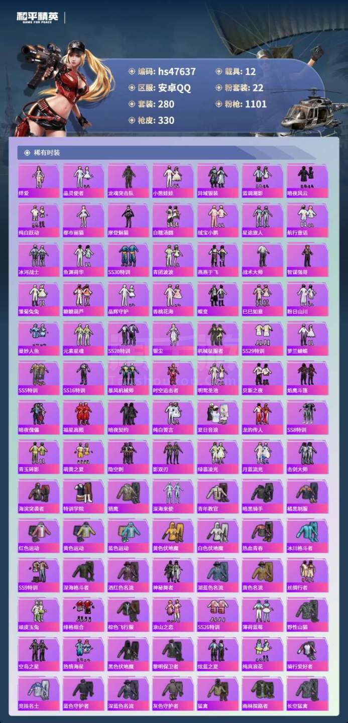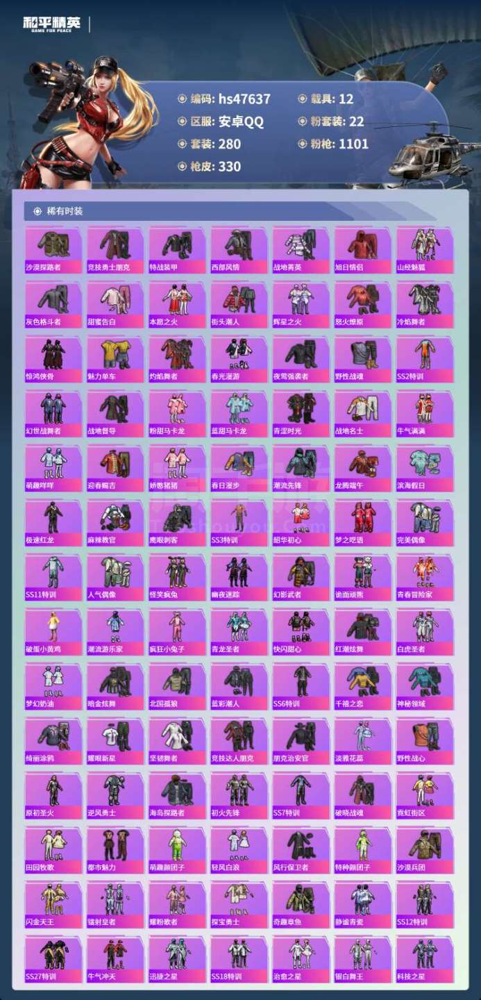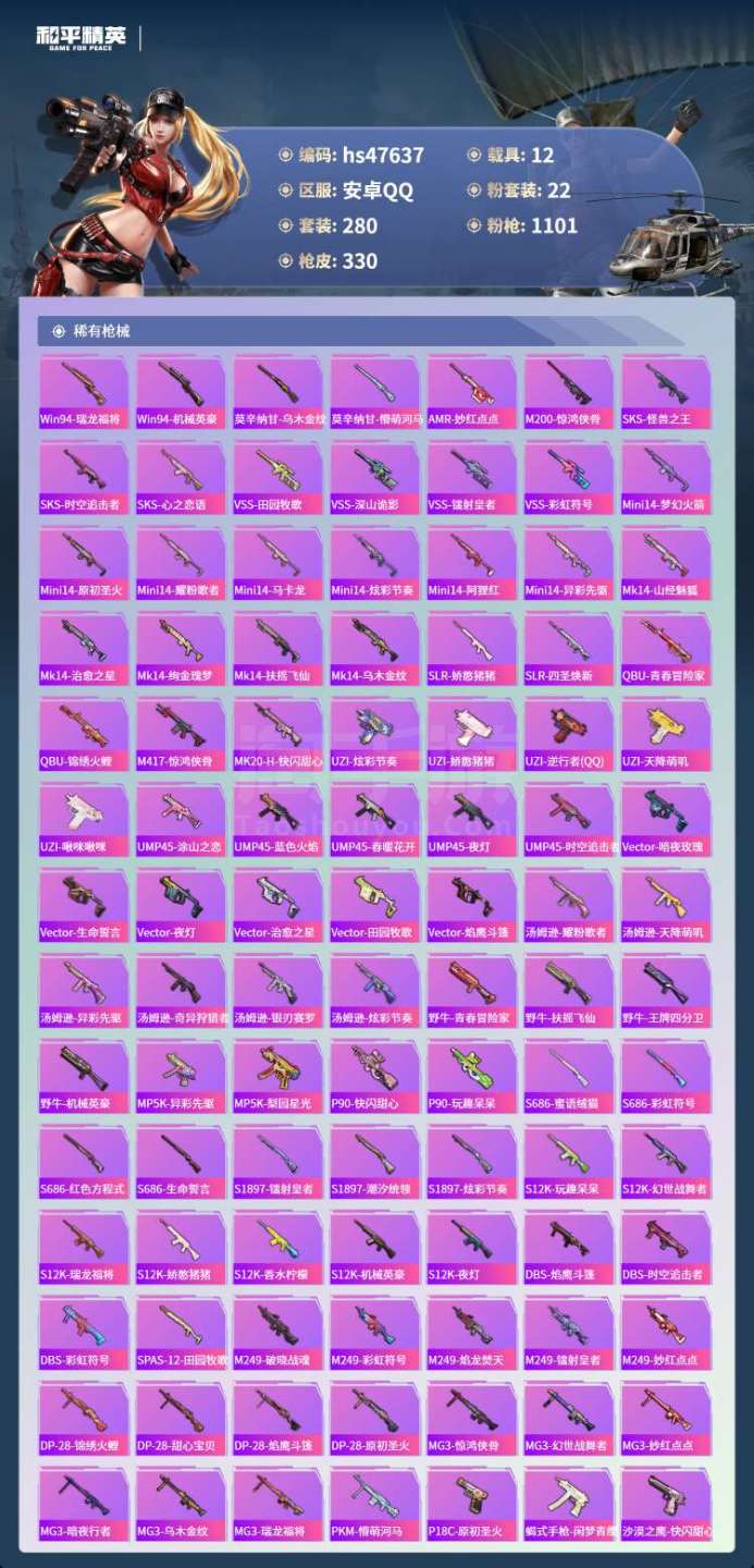 hs47637 安卓手Q-23王牌印记-22粉装-12特效枪-12载具-143417热力值-280套
