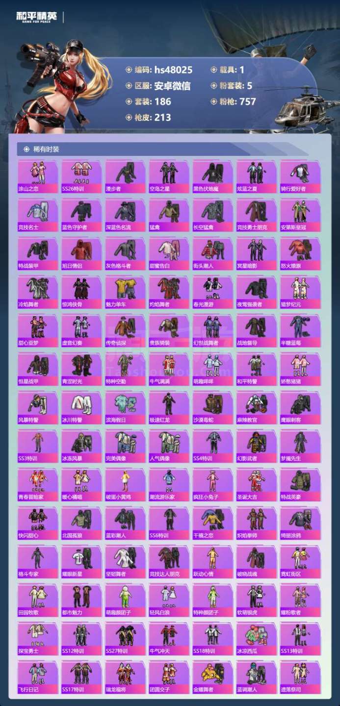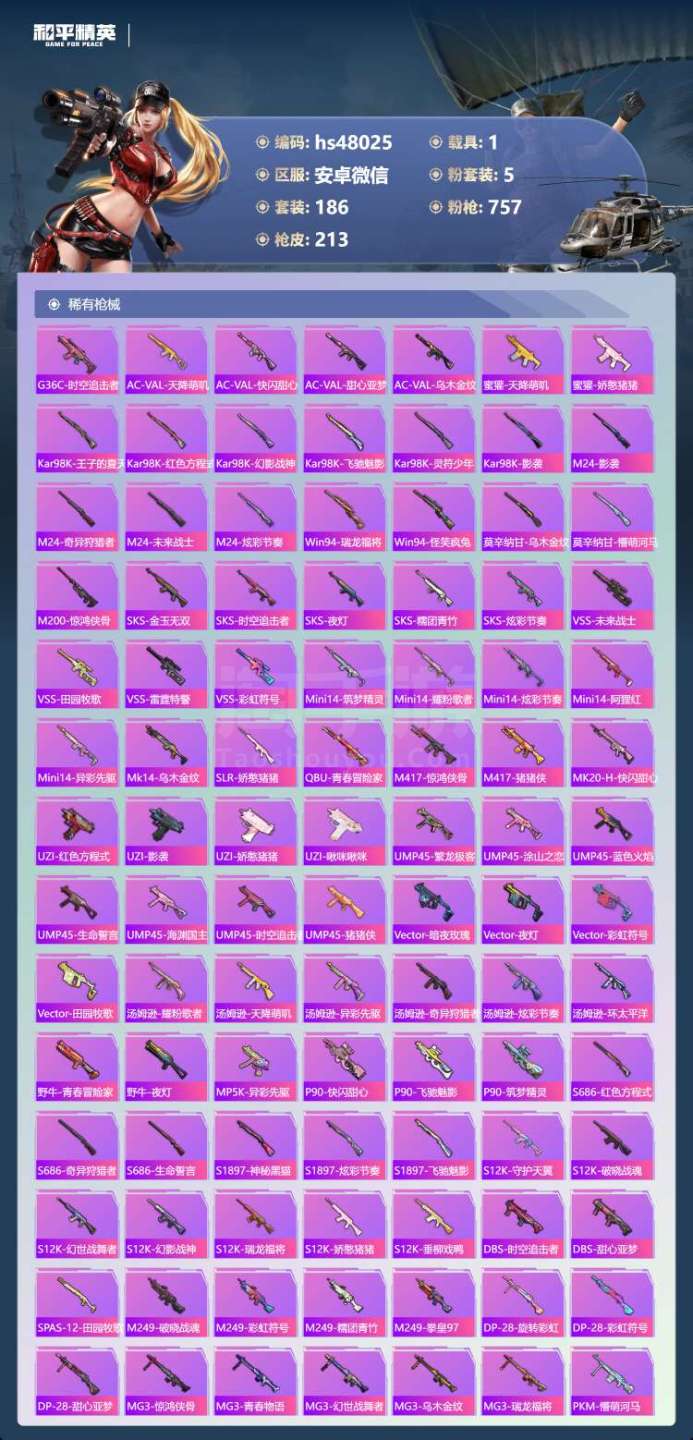 hs48025 安卓微-10王牌印记-5粉装-2特效枪-1载具-68612热力值-186套装-21