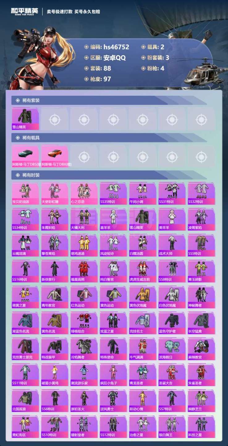 安卓Q-2载具3粉装4特效枪11热门88套装97枪皮 35296热力值 6印记 历史超级王牌12星