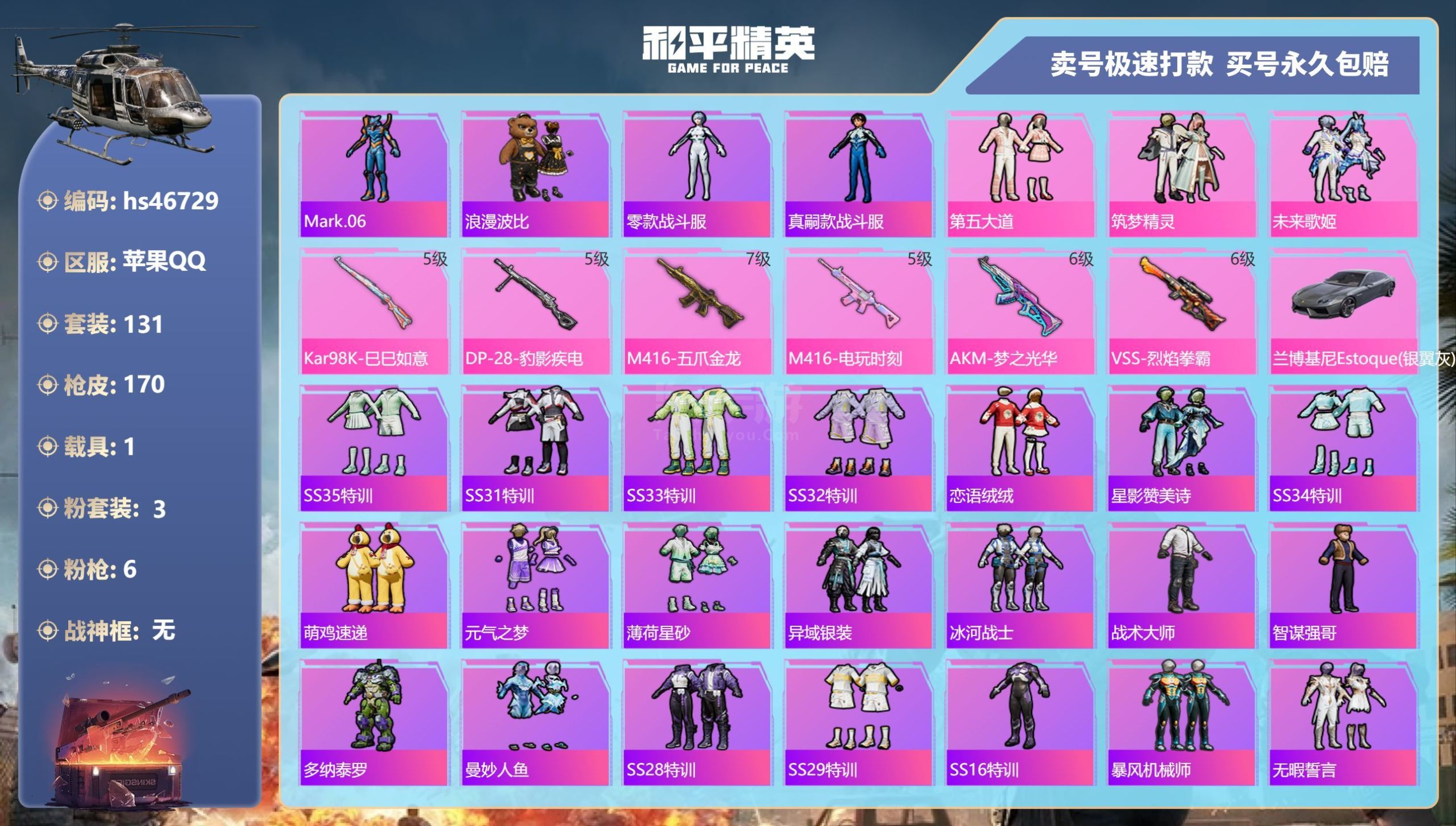 苹果Q-1载具3粉装6特效枪13热门131套装170枪皮 57627热力值 13印记 历史超级王牌1