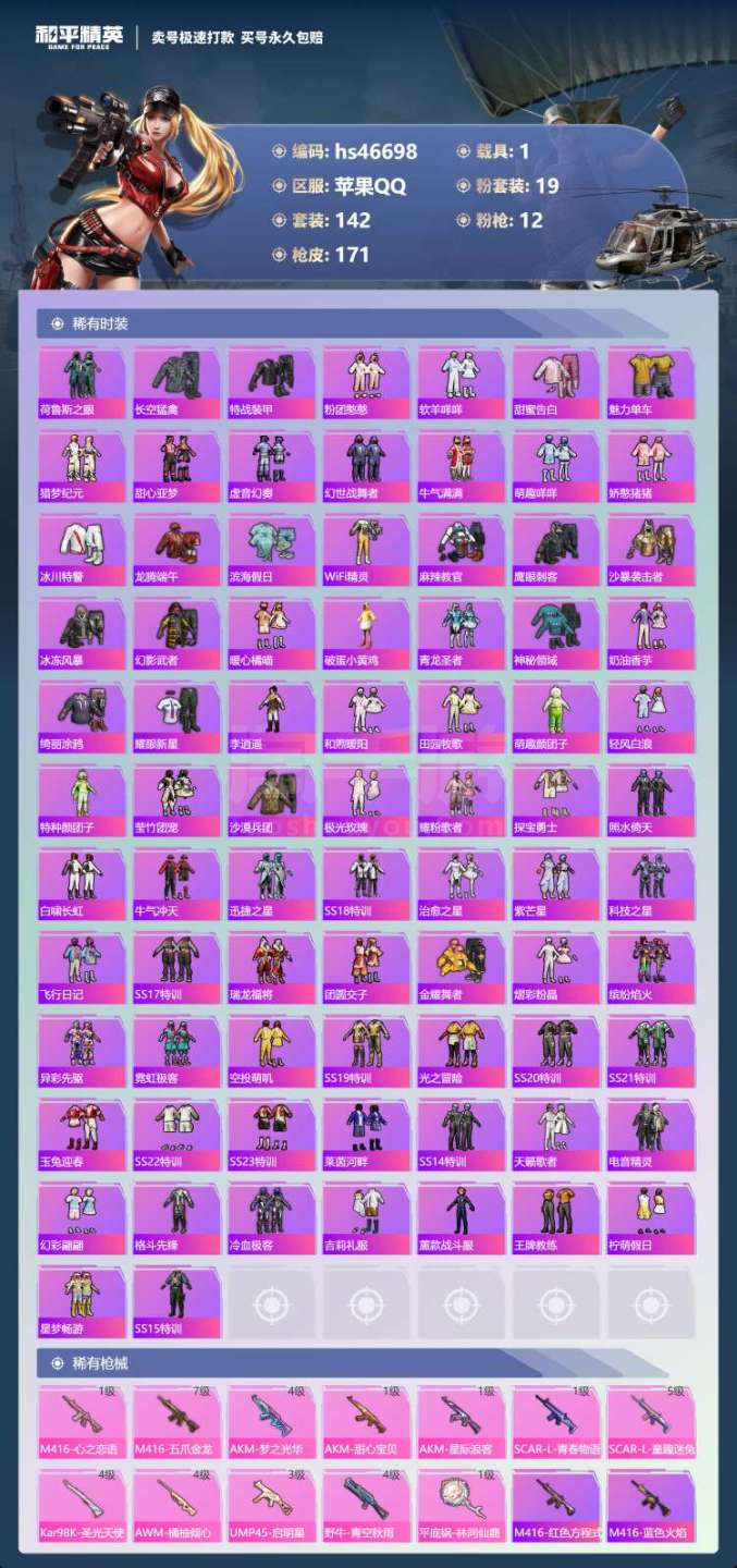 苹果Q-4稀有1载具19粉装12特效枪21热门142套装171枪皮 67431热力值 8印记 历史超