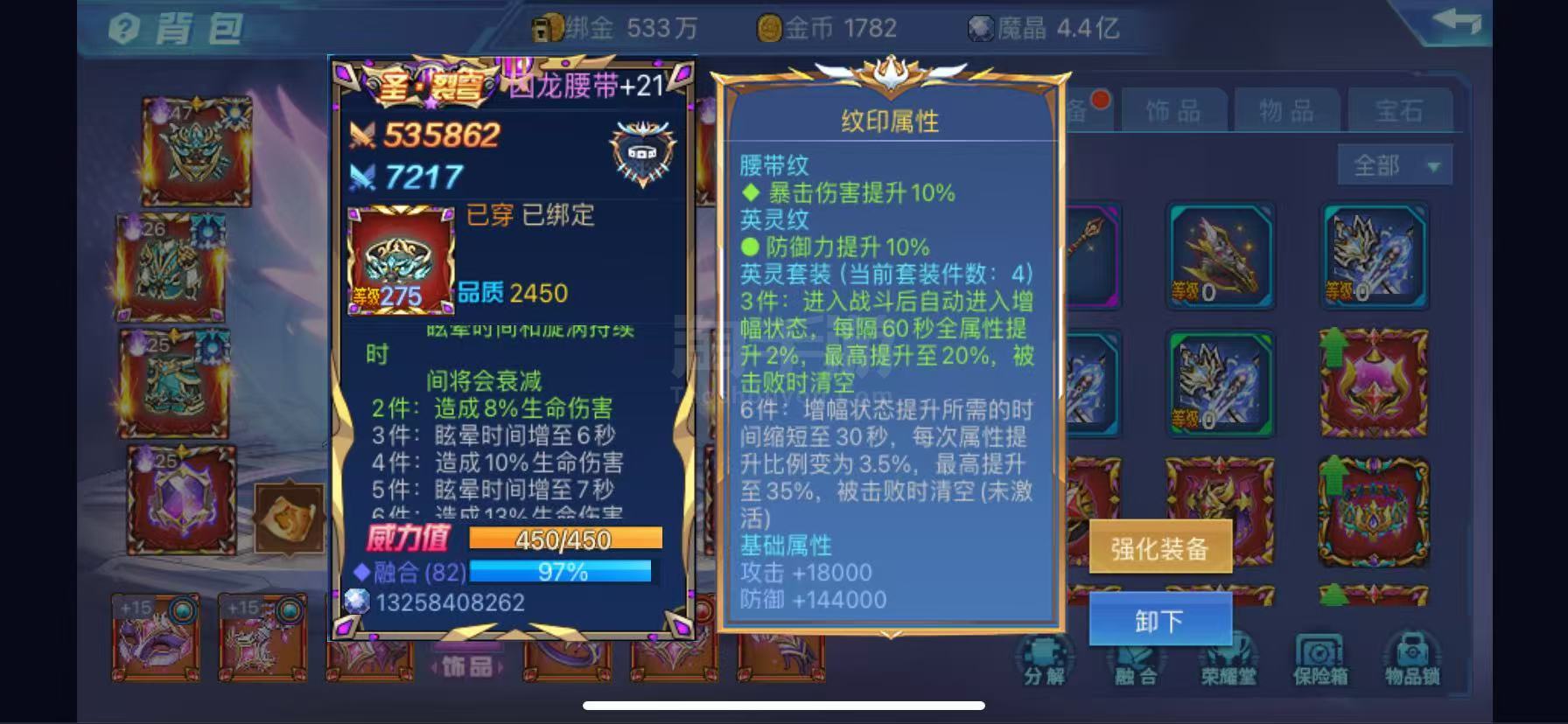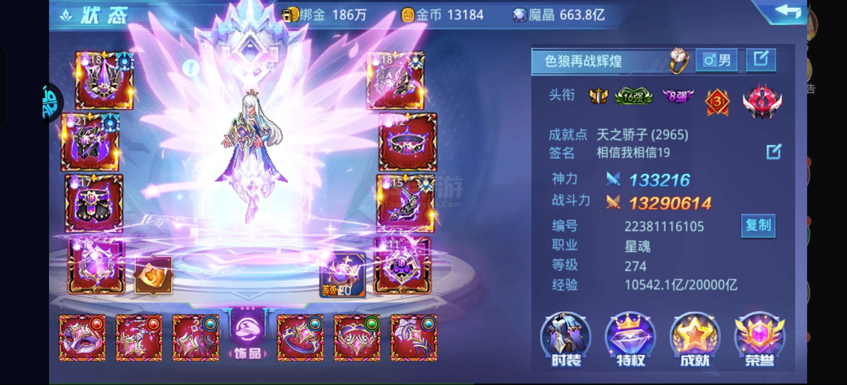 合33大区无改名1372万带2千亿魔晶,星魂满战甲觉醒,强力角色有冰凌,双子,云峦,VIP10级,机甲只差1个,装备圣蛮荒4件,圣裂穹2件,圣蛮荒徽章对,饰品红月套,符印特效:元素祝福,绝版宝石和翅膀,还有两个彩虹石,守护有云峦破防苹果商店下载的版本可换绑
