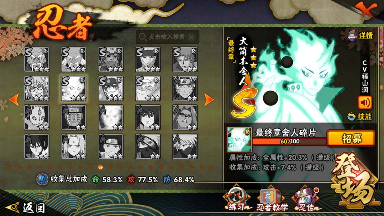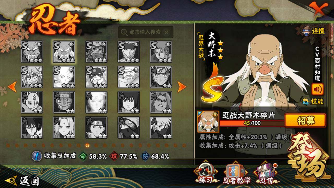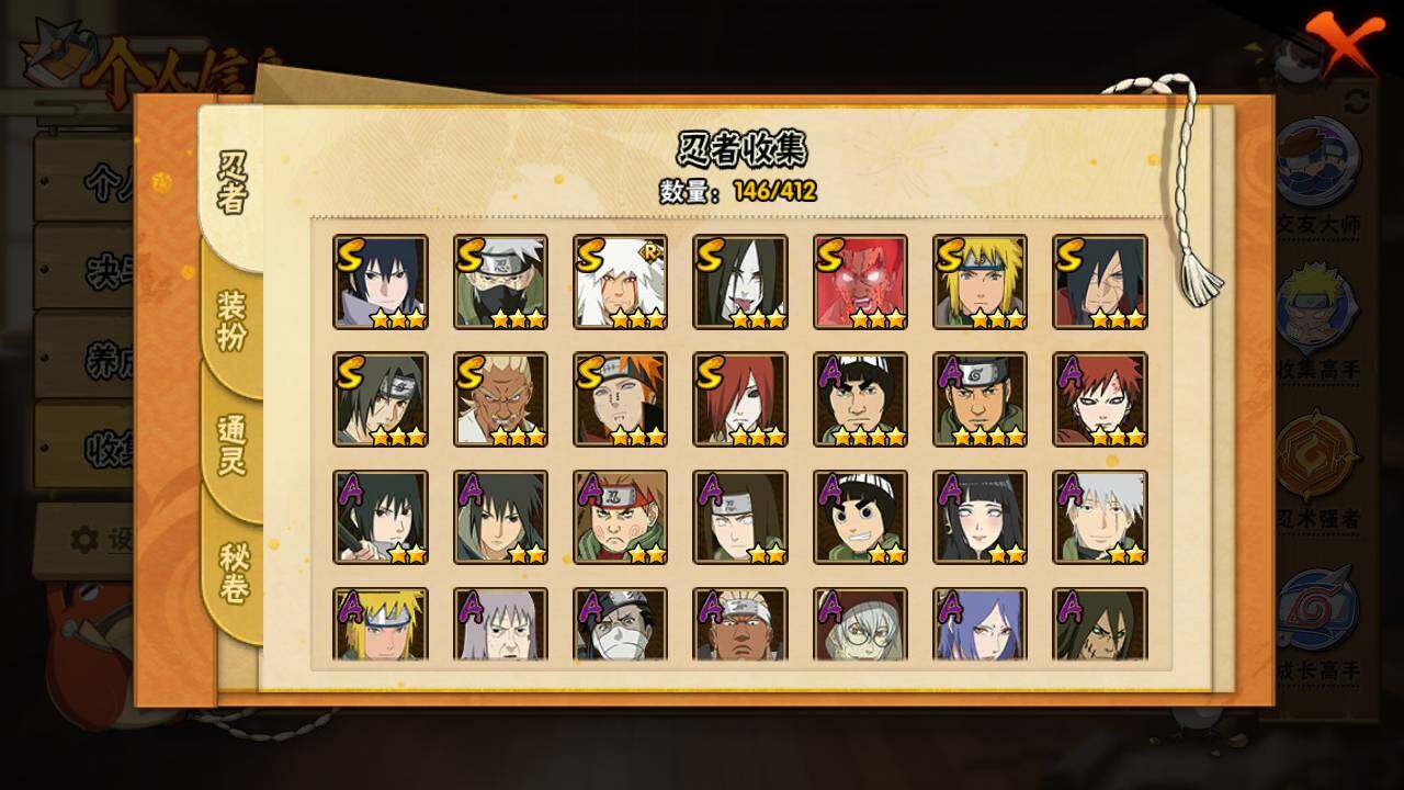 【S级忍者】:长门「秽土转生」(3星),宇智波斑「秽土转生·解」(3星),艾「忍界大战」(3星),宇智波鼬「须佐能乎」(3星),旗木卡卡西「须佐能乎」(3星),自来也「舞之豪杰」(3星),大蛇丸(3星),波风水门(3星),迈特凯「死门」(3星),佩恩「天道」(3星),宇智波佐助「永恒