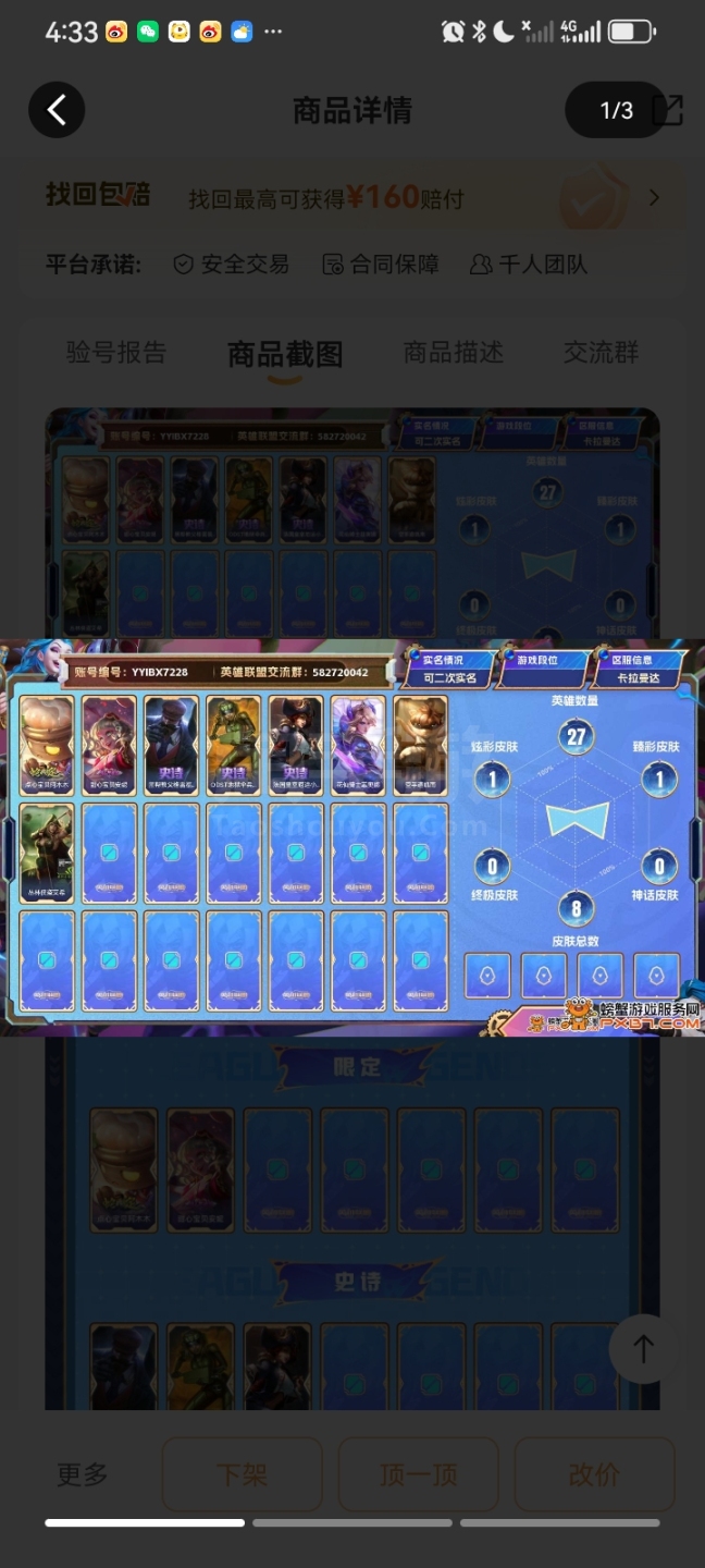 通过App,与卖家商议价格及保险,并向卖家索要账号最新截图,确认后下单购买。