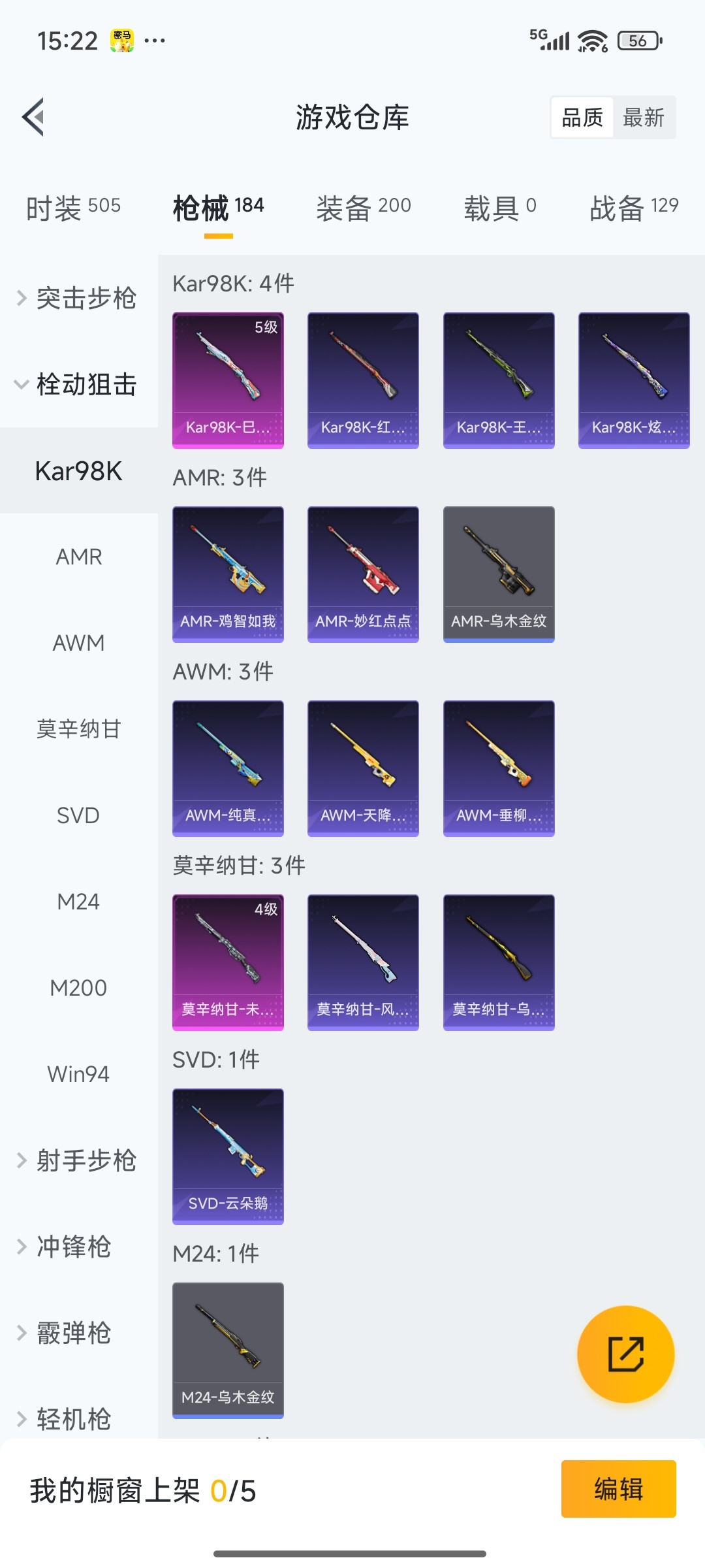 【7特效枪】Famas-觉醒初号机(7级)M416-电玩时刻(5级)Kar98K-巳巳如意(5级)DP-28-豹影疾电(5级)AUG-暖羊咩咩(5级)GROZA-镜光银凌(5级)莫辛纳甘-未来领航