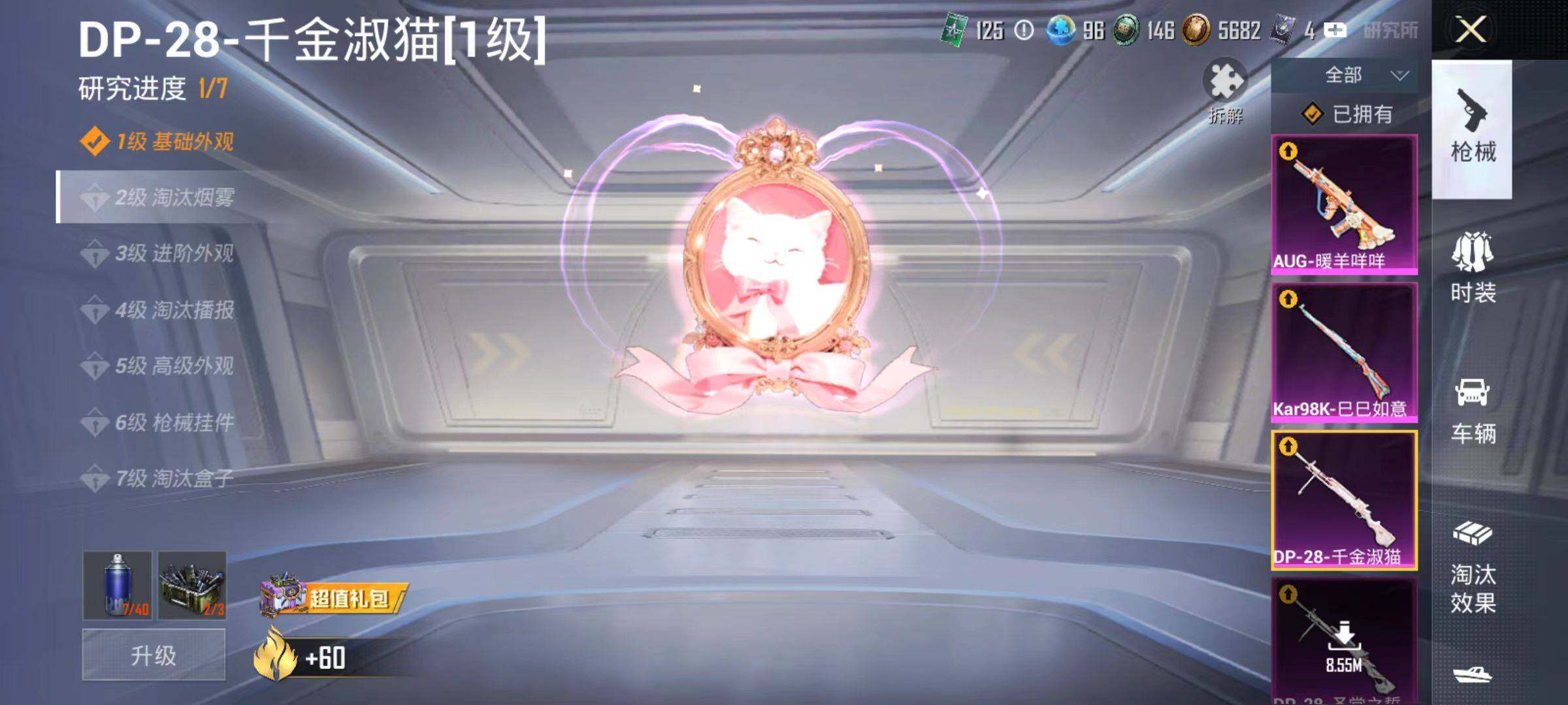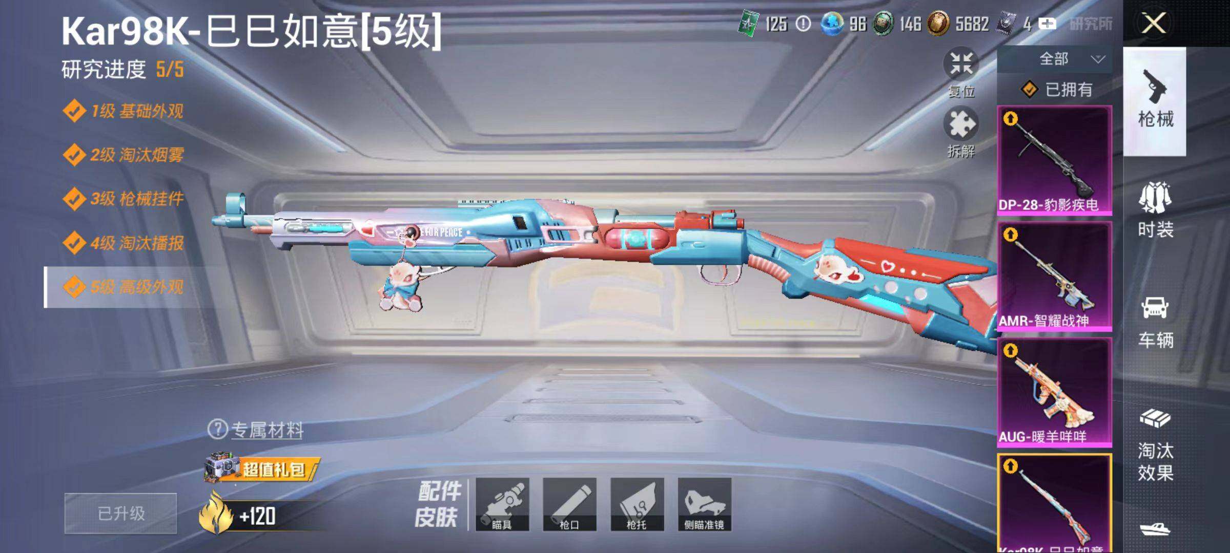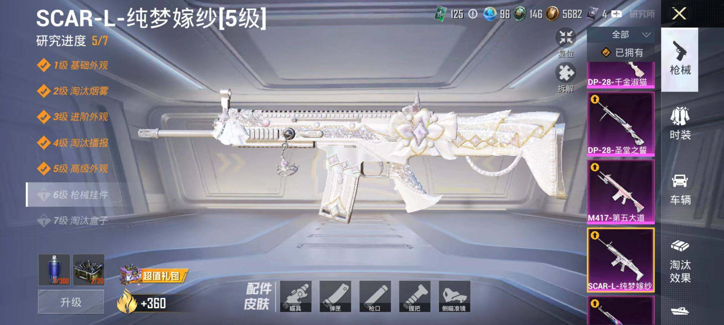 【粉色枪皮等级】:AKM-梦之光华(五级),SCAR-L-纯梦嫁纱(五级),AUG-暖羊咩咩(五级),