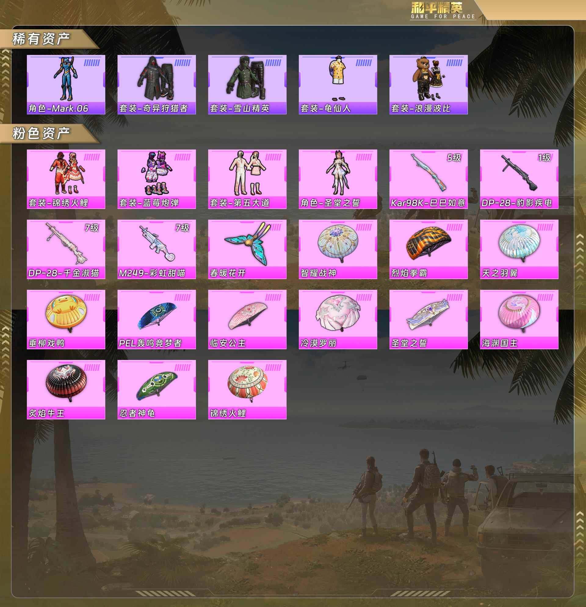 地铁马上满天赋/蓝螳螂/浪漫波比/锦绣火鲤/蓝莓炮弹/第五大道/圣堂之誓/Kar98K-巳巳如意[5级]/DP-28-豹影疾电[1级]/DP-28-千金淑猫[7级]/M249-彩虹甜喵[7级]/没战神框 hp3146
