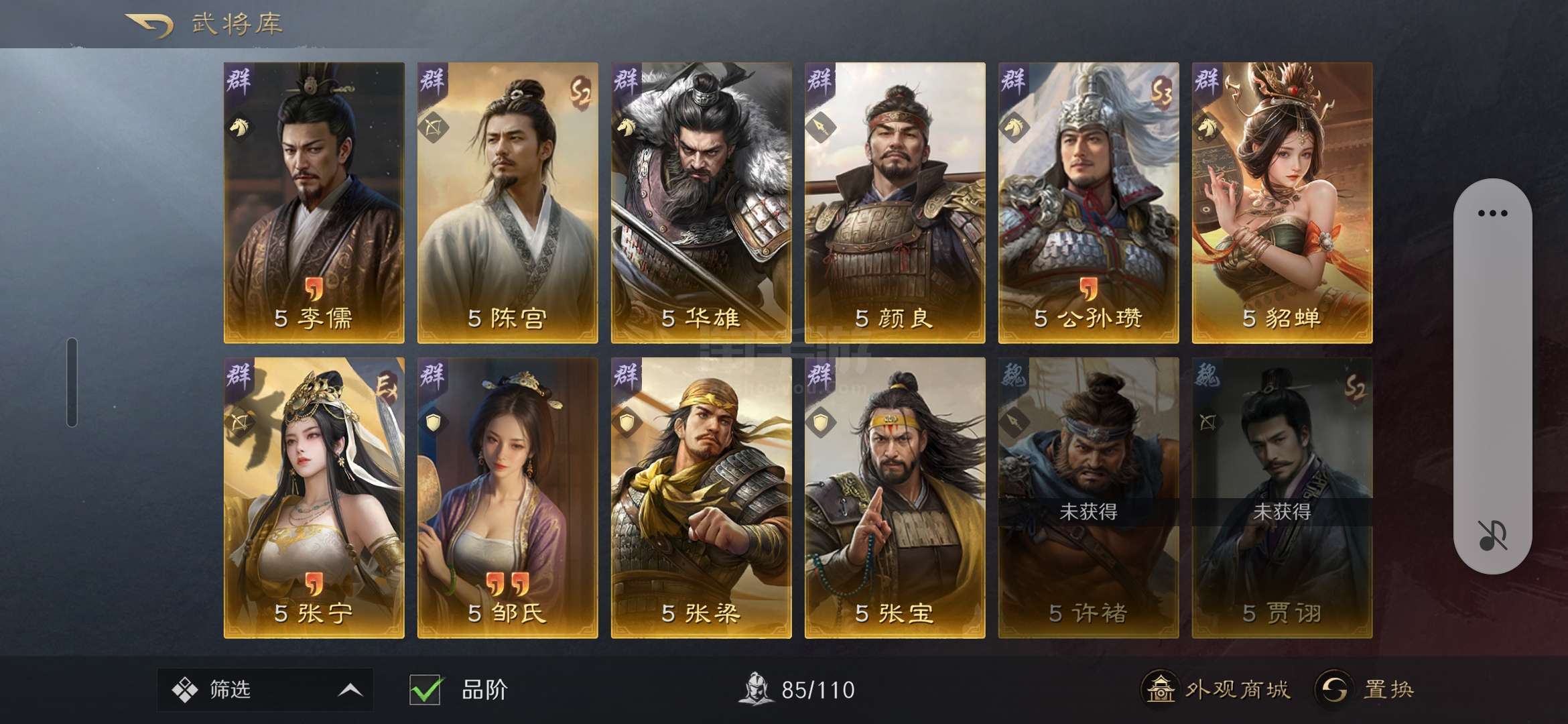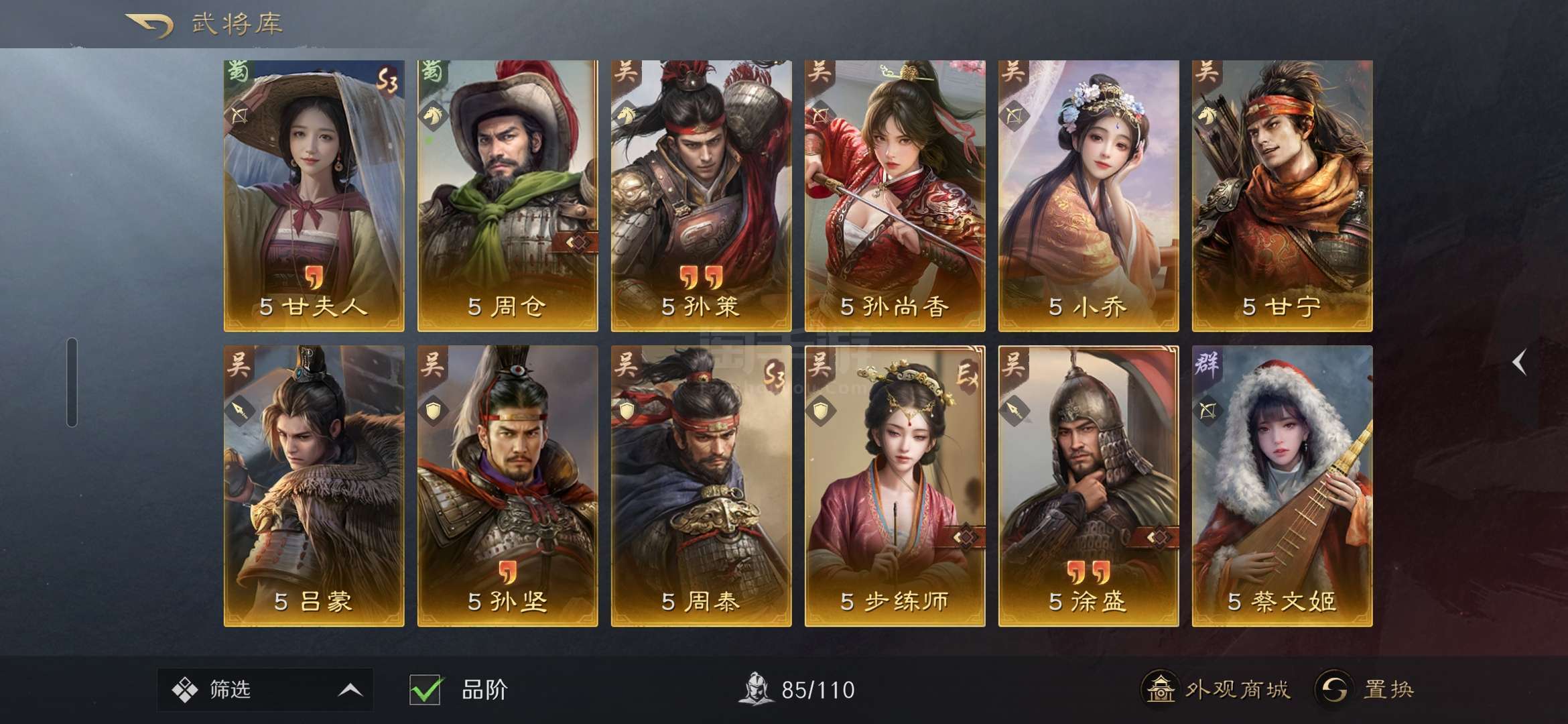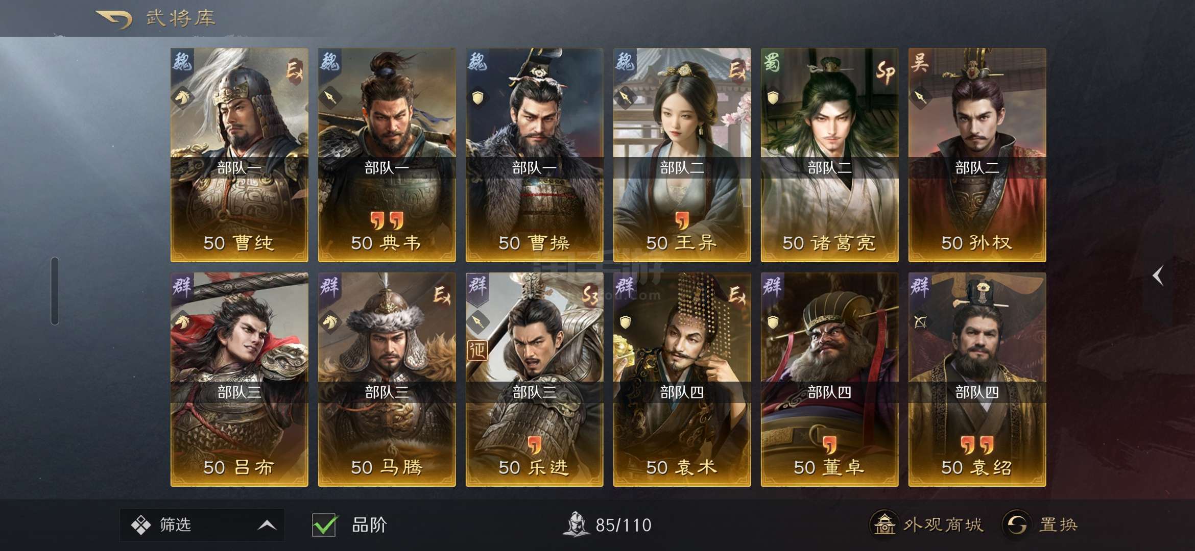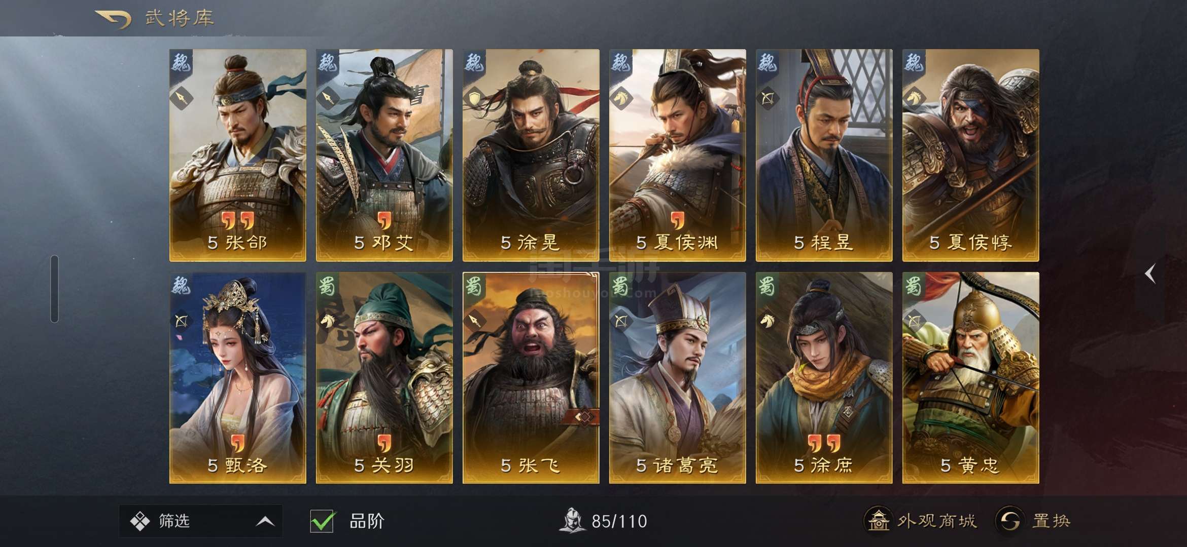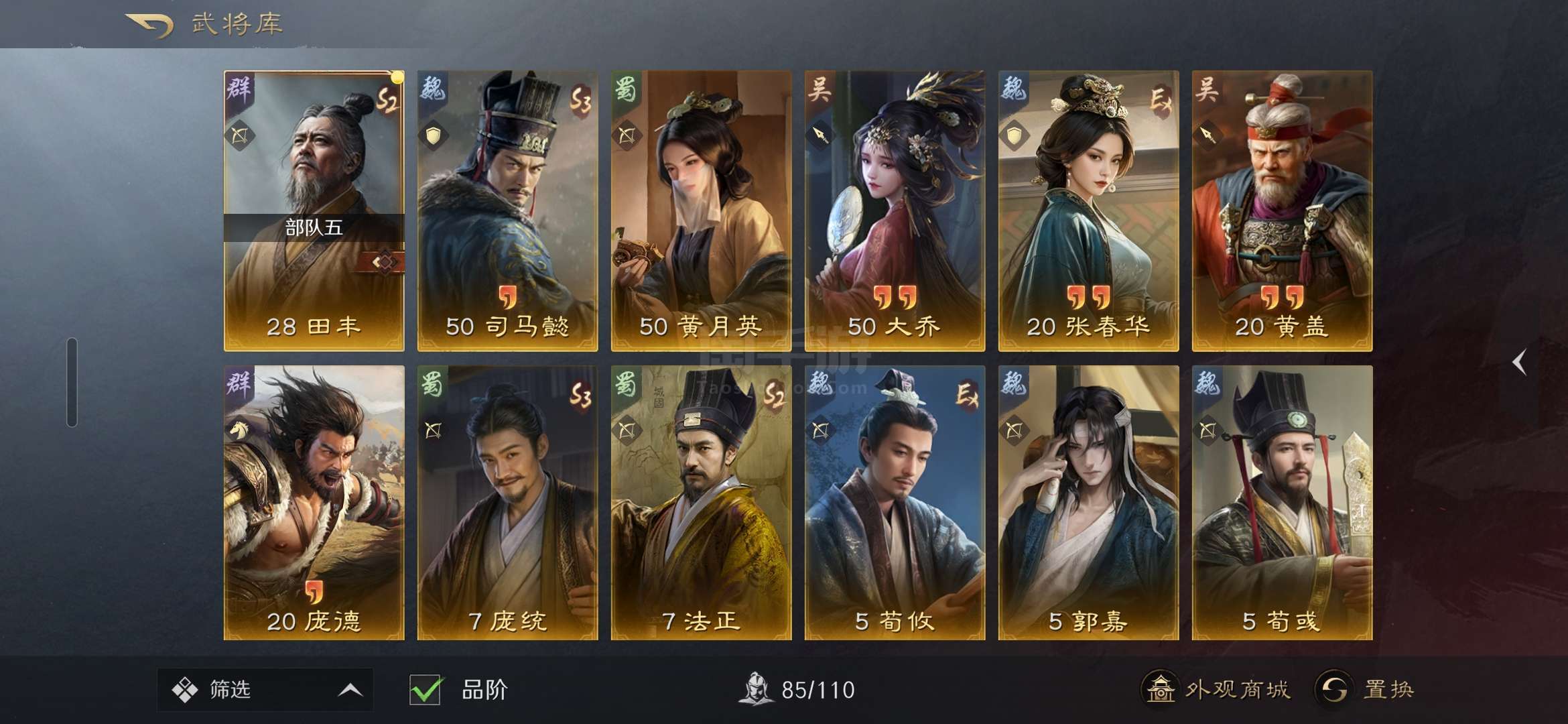 85个武将,战法基本都有,3个武将有品,很多红°挺好的,有月卡