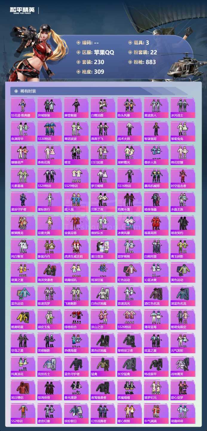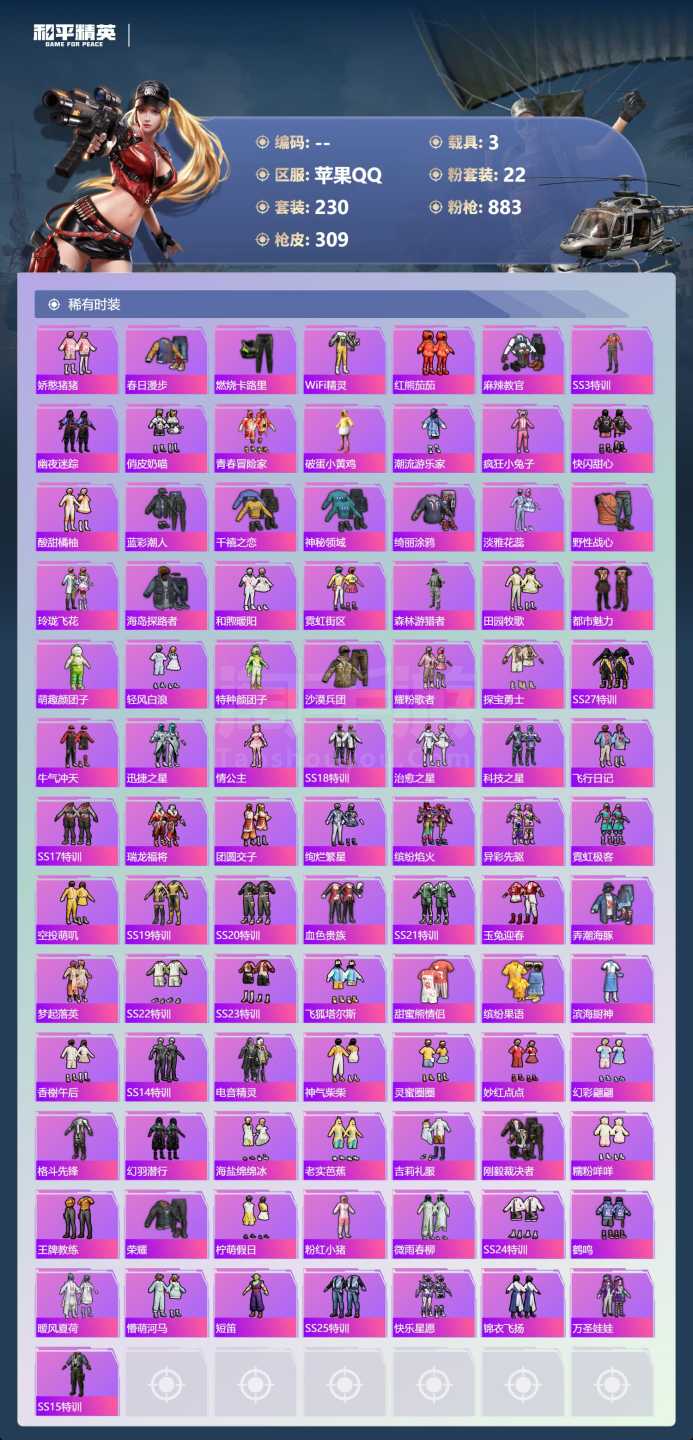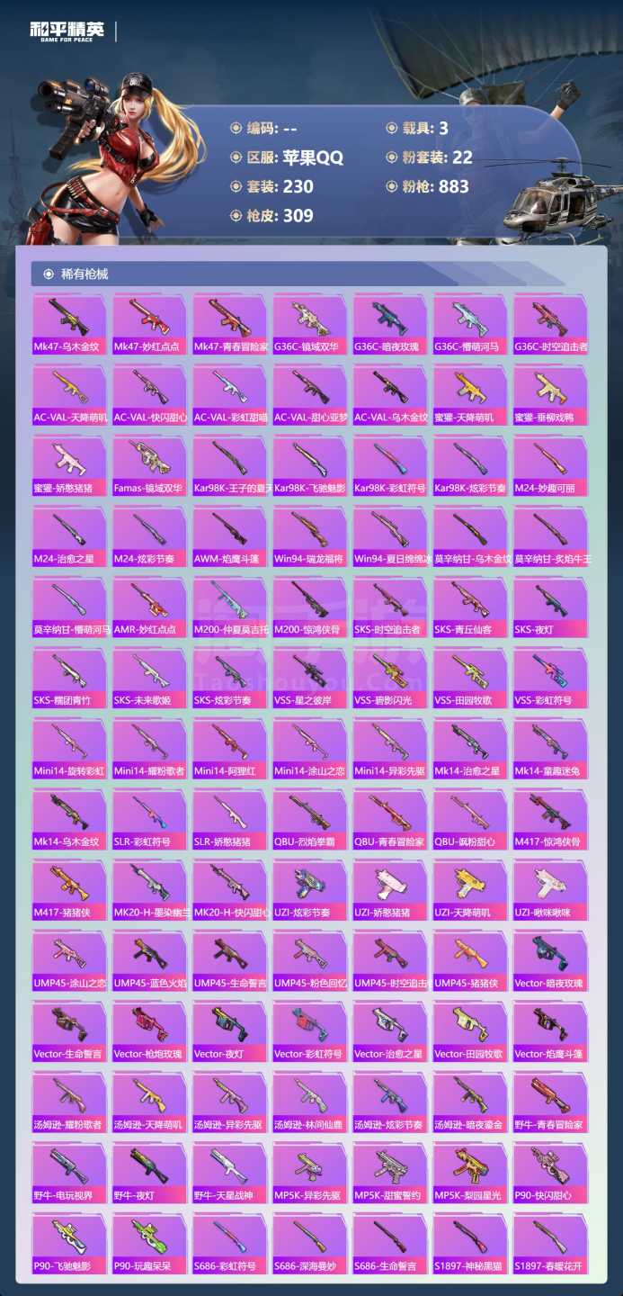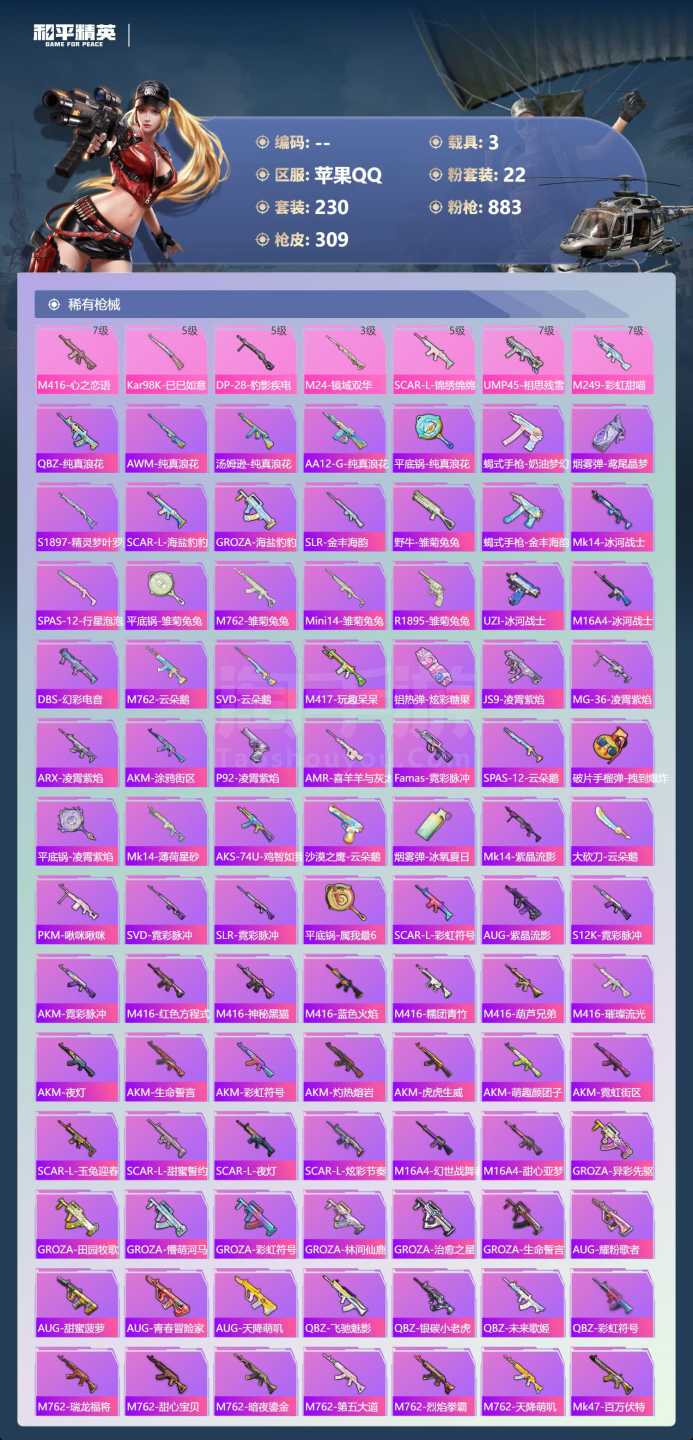 a4061/苹果QQ/-21王牌印记-有战神框-1红装-22粉装-7特效枪-3载具-114230热力