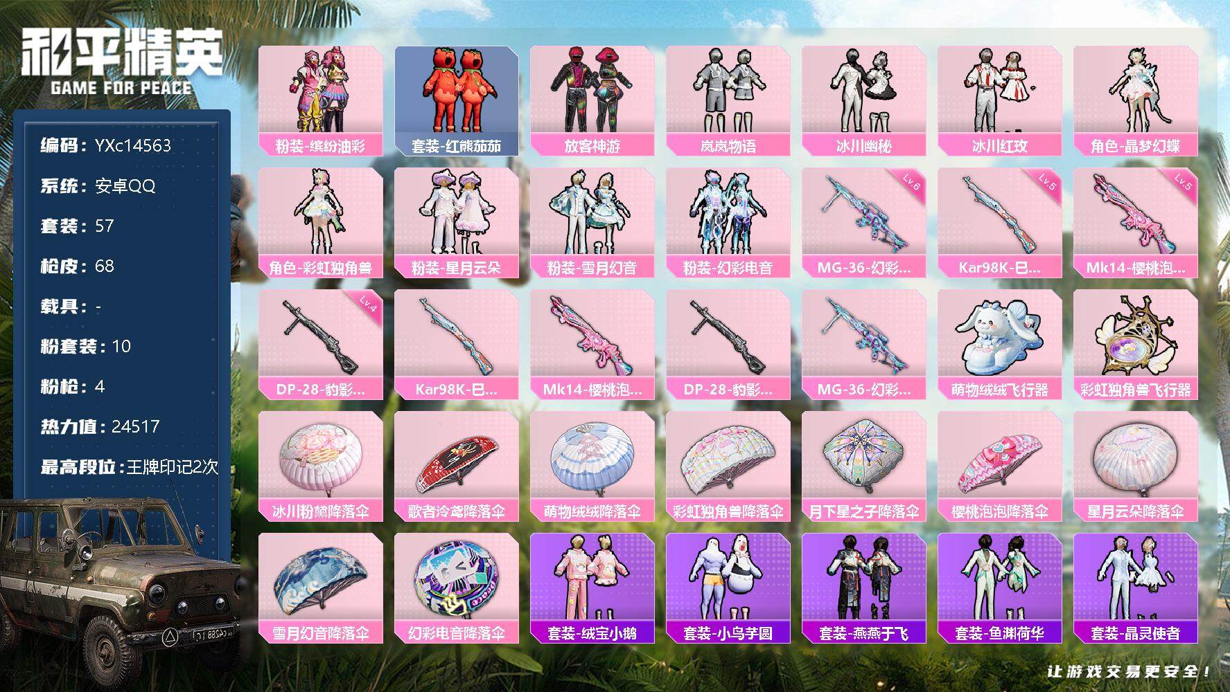 【猪妹 放客 星月 独角兽 晶梦 番茄 兔兔 晶辉 岚岚 精美女号】YXc14563【无二次】【因赛季更新游戏段付以上号为准!】 安卓Q-2w热力值 2王牌印记 历史卓越王牌5星 57套装 68枪皮 【10粉装】 雪月幻音 彩虹独角兽 晶梦幻蝶 幻彩电音 星月云朵 缤纷油彩 放客神游 冰川幽秘 冰川红玫 岚岚物语 【4特效枪】 Kar98K-巳巳如意 (5级) MG-36-幻彩电音 (6级) D