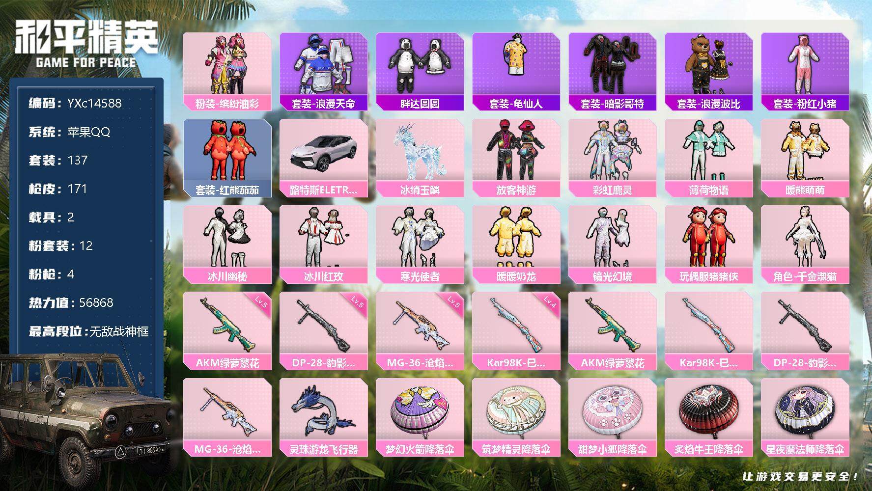 和平精英【苹果QQ】【战神框 猪妹 放客 番茄 胖达 哥特】【可二次】YXc14588 苹果Q 1