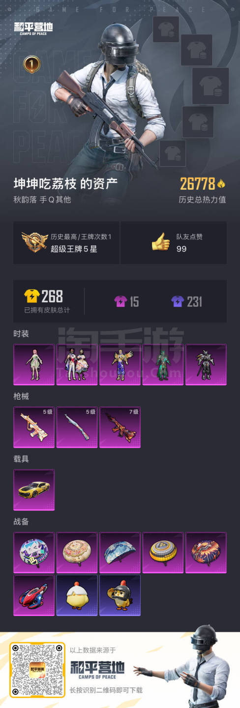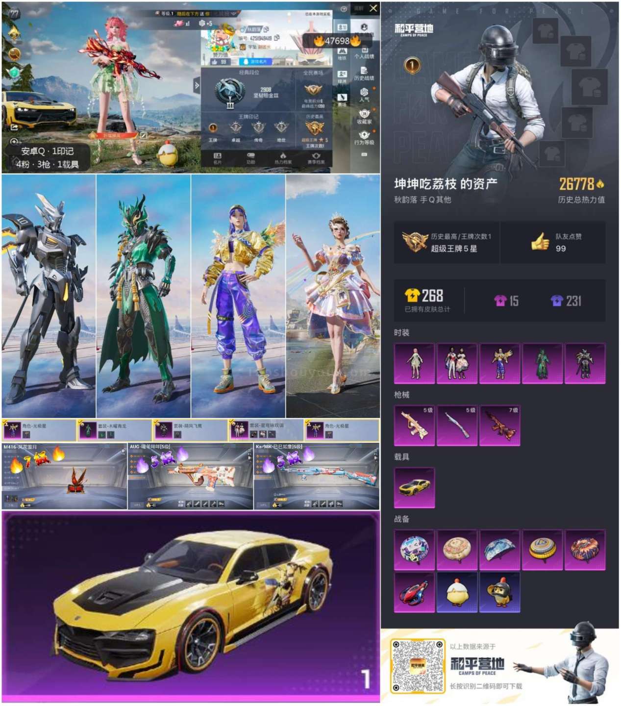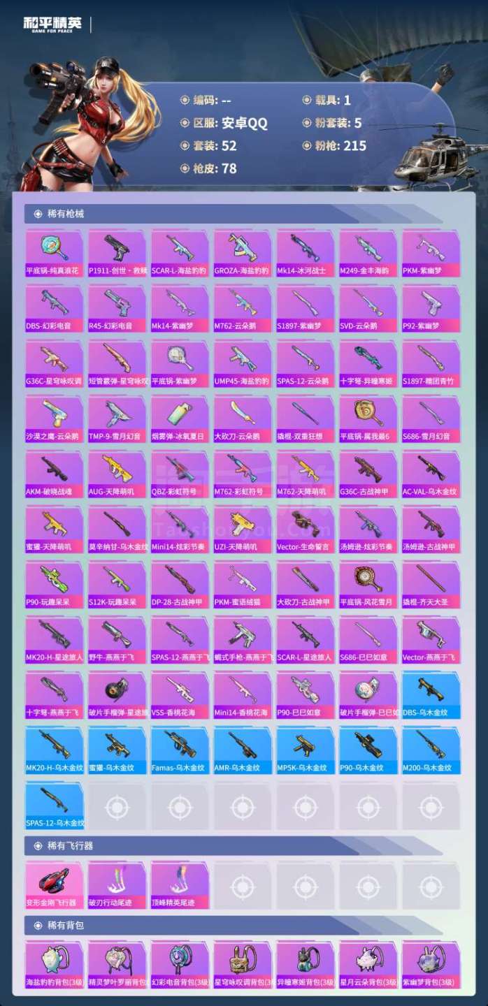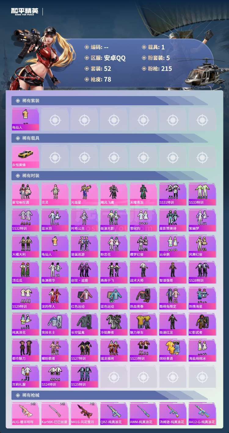 hs47698 安卓手Q-1王牌印记-5粉装-3特效枪-1载具-26778热力值-52套装-78枪皮