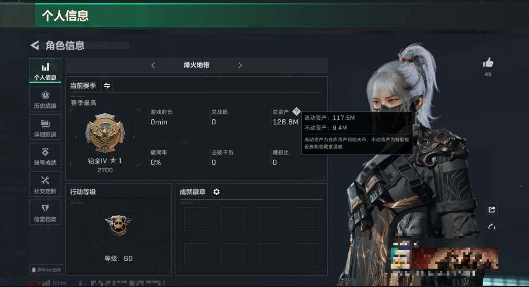 总资产110m 纯币54m +水墨云图骇爪全套+s3赛季通行证+烽火等级60 特勤部门等级很高 永久包赔
