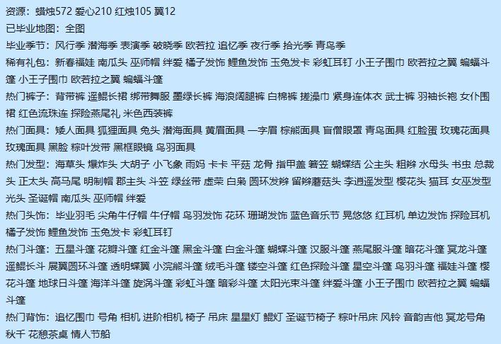 稀有礼包:新春福娃 南瓜头 巫师帽 绊爱 橘子发饰 鲤鱼发饰 玉兔发卡 彩虹耳钉 小王子围巾 欧若拉之翼 蝙蝠斗篷 小