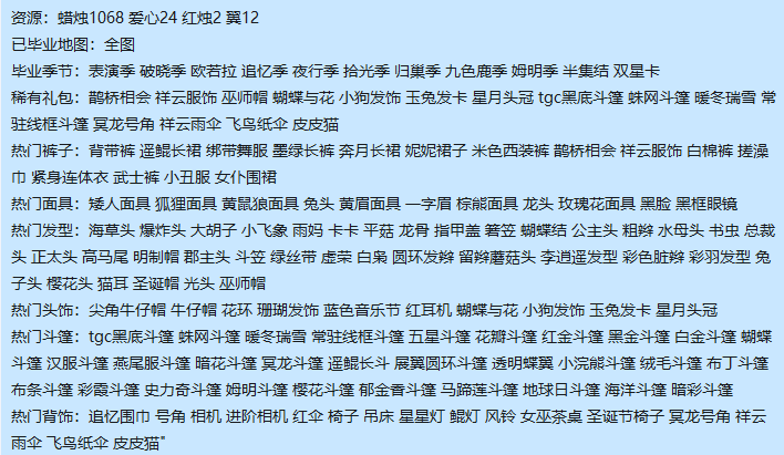 稀有礼包:鹊桥相会 祥云服饰 巫师帽 蝴蝶与花 小狗发饰 玉兔发卡 星月头冠 tgc黑底斗篷 蛛网斗