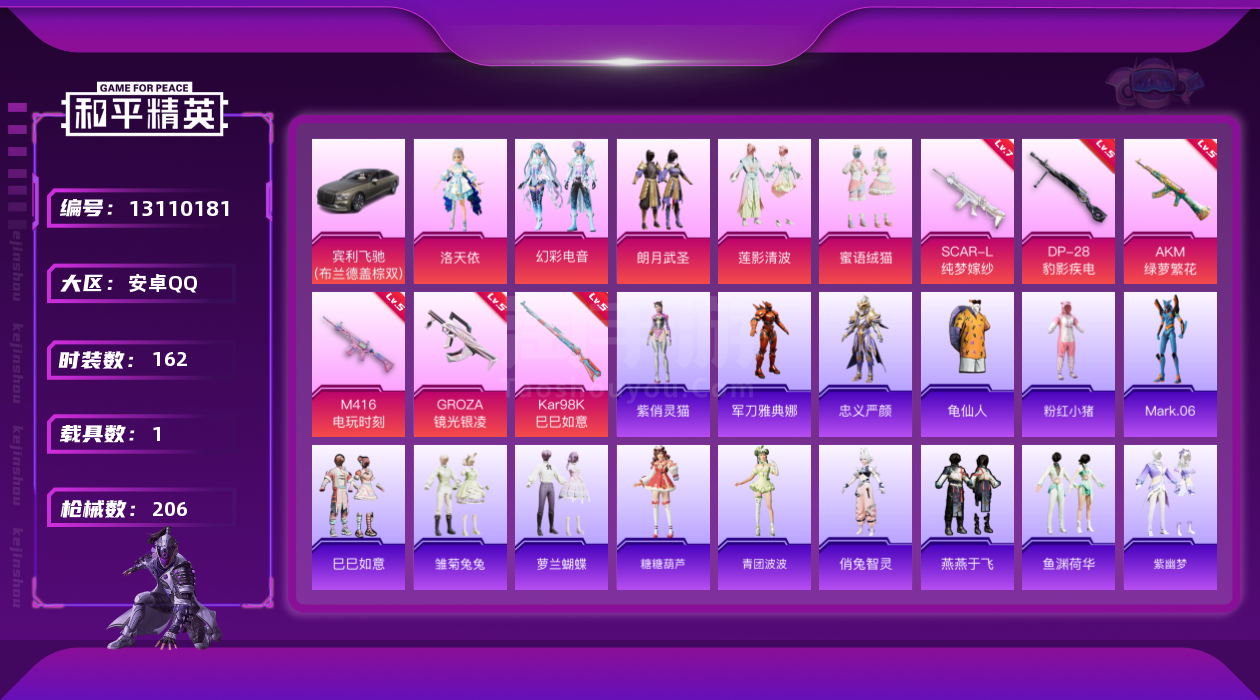 和平精英【安卓QQ】安卓Q-1载具5粉装6特效枪13热门162套装206枪皮 10印记 历史超级王牌9星