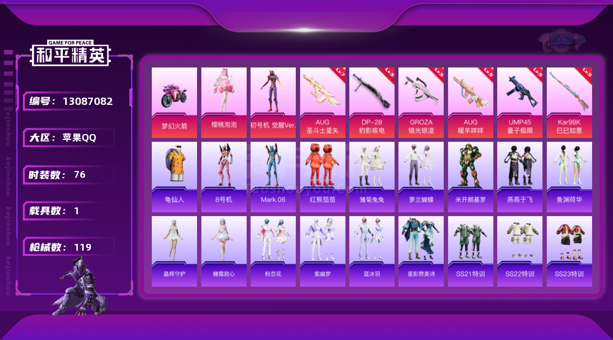 和平精英【苹果QQ】苹果Q-1载具3粉装6特效枪6热门76套装119枪皮 8印记 历史卓越王牌11星