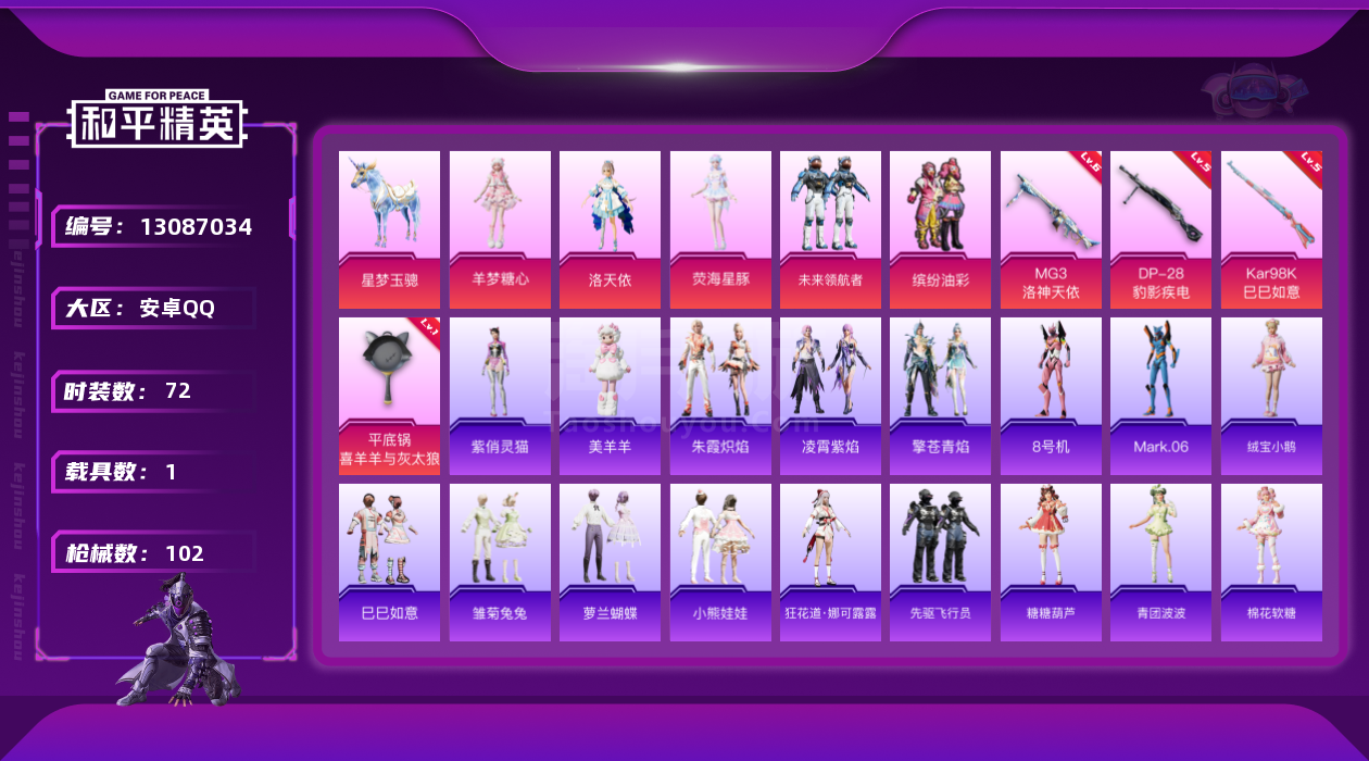 和平精英【安卓QQ】安卓Q-1载具5粉装4特效枪2热门72套装102枪皮 2印记 历史超级王牌4星