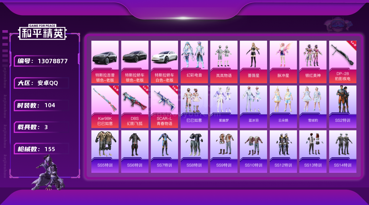 和平精英【安卓QQ】安卓Q-3载具5粉装4特效枪8热门104套装155枪皮 2印记 历史超级王牌4星