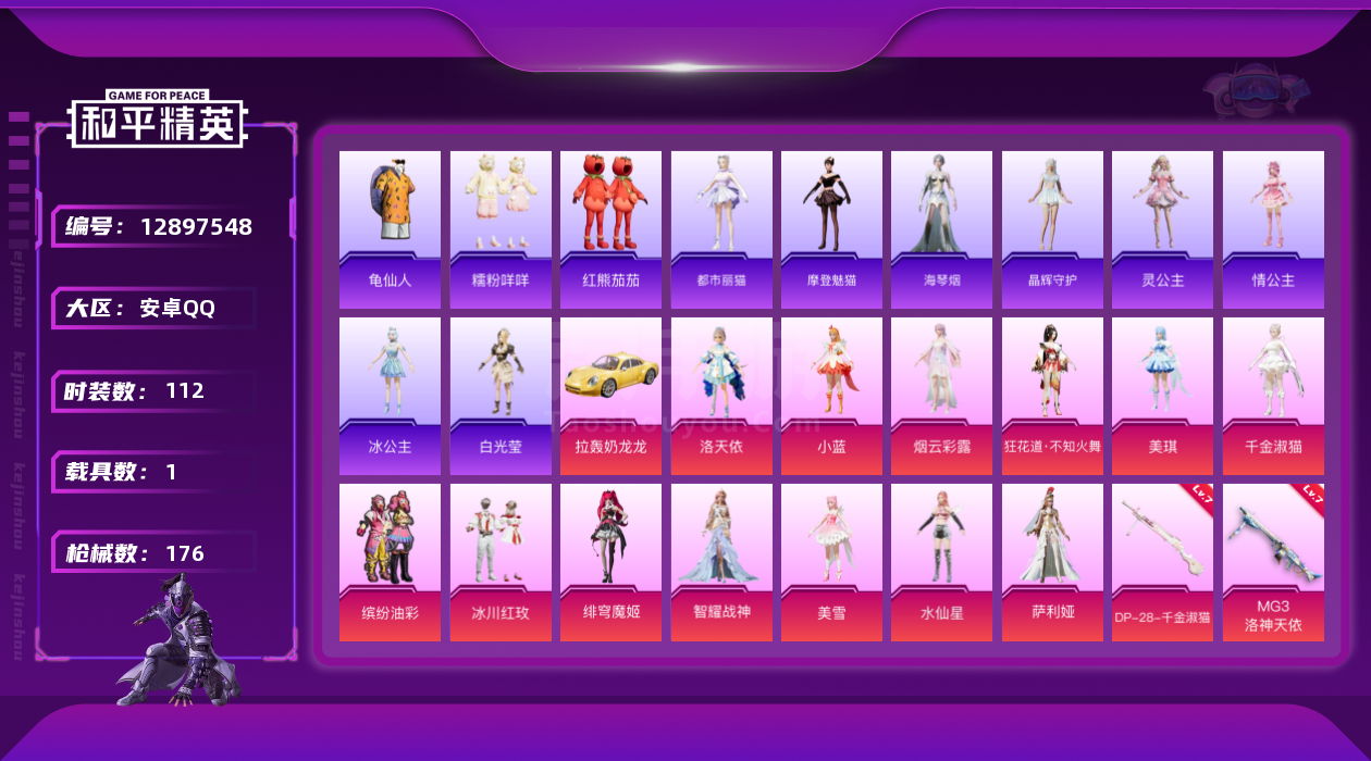 和平精英【安卓QQ】安卓Q-2载具14粉装7特效枪3热门112套装176枪皮 9印记 历史超级王牌17星