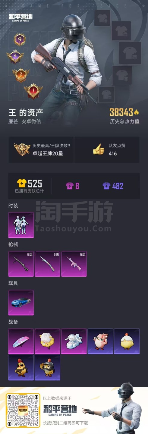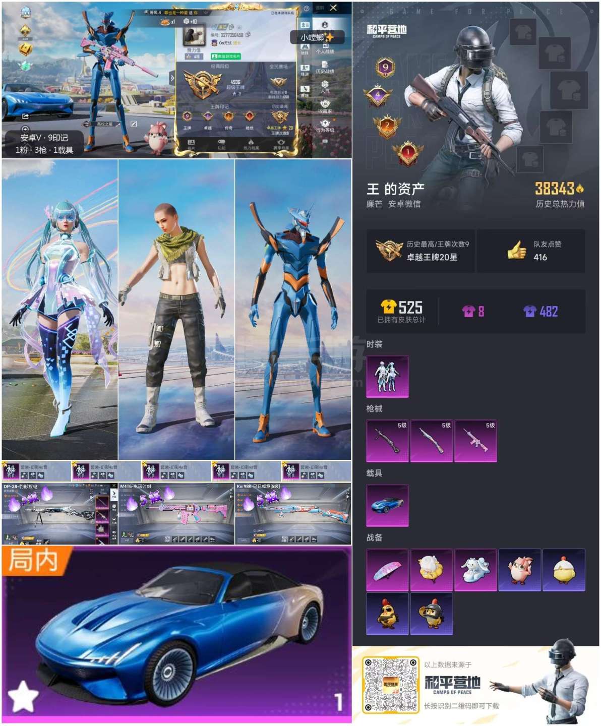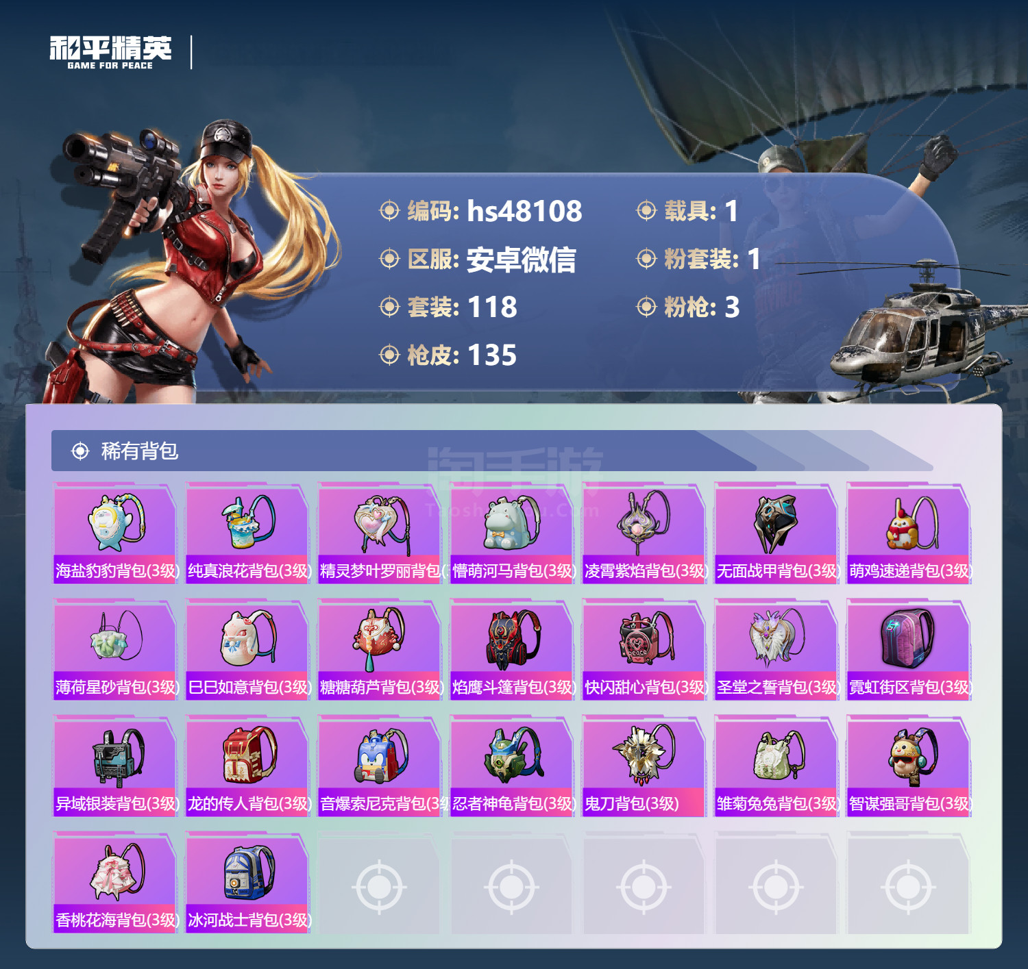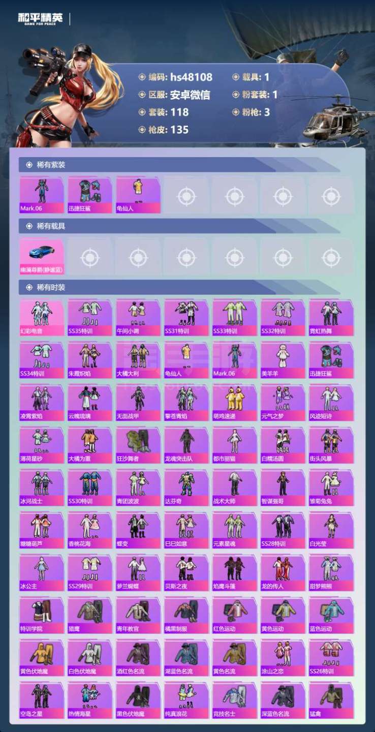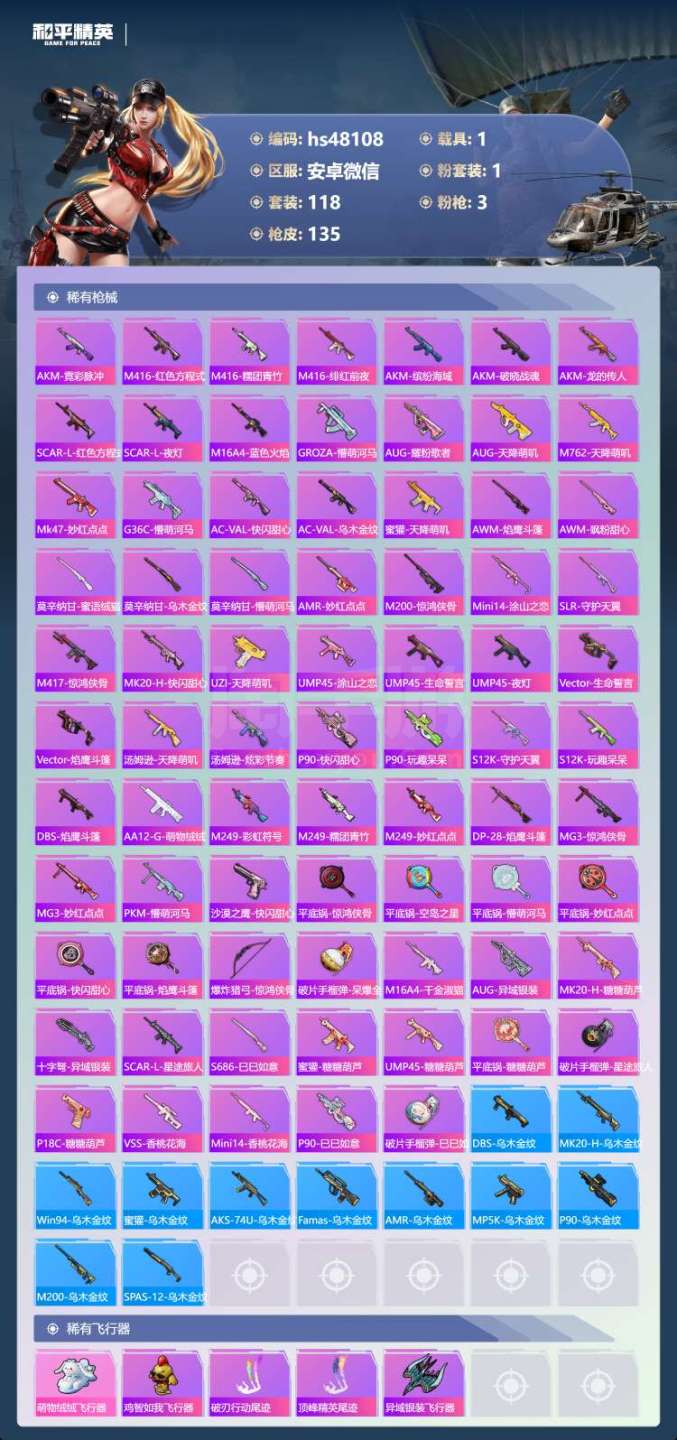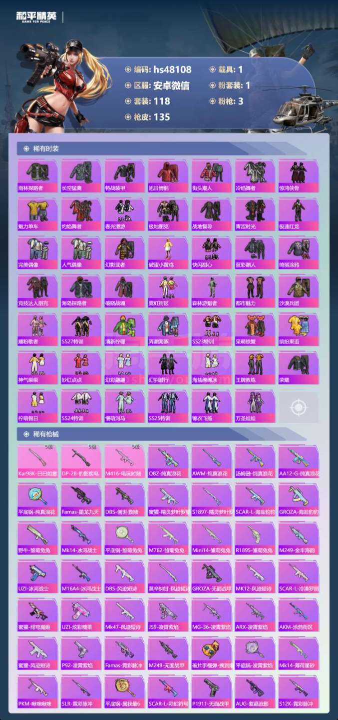 和平精英【安卓微信】hs48108 安卓v-9王牌印记-1粉装-3特效枪-1载具-38343热力值-118套装-135