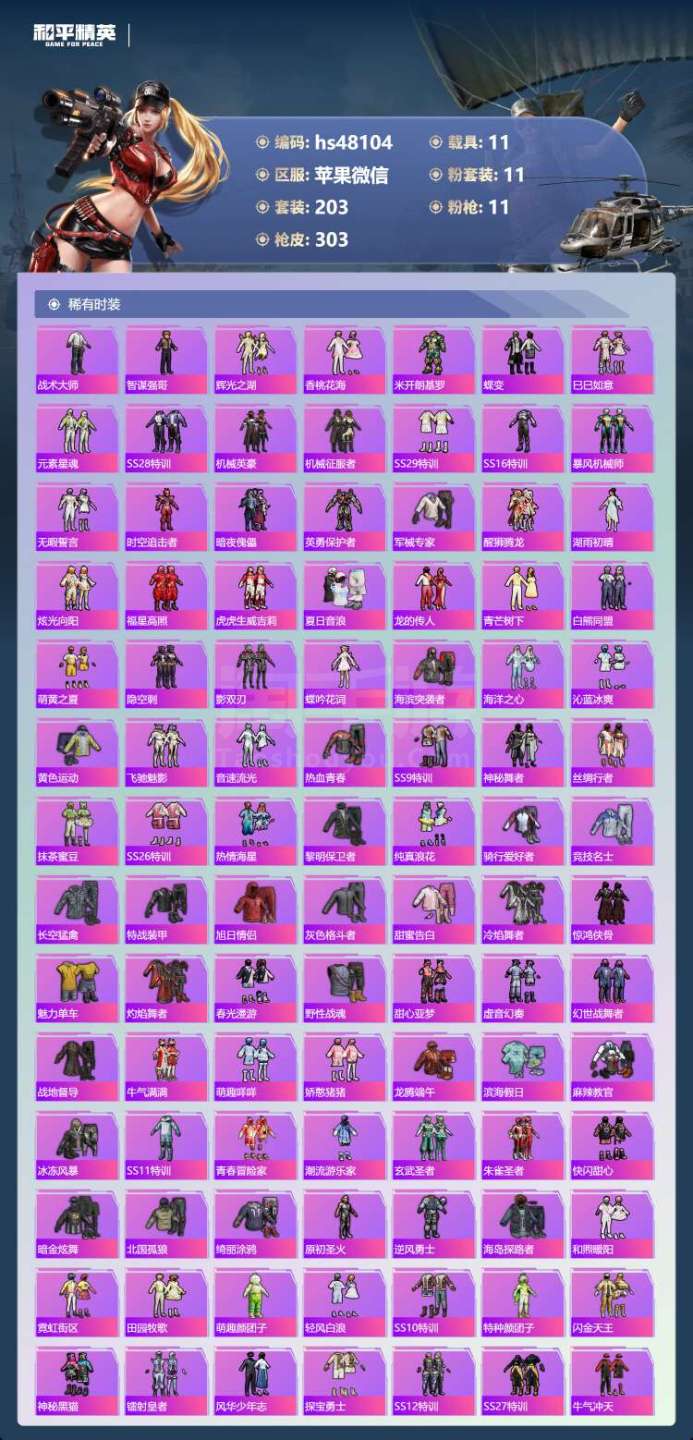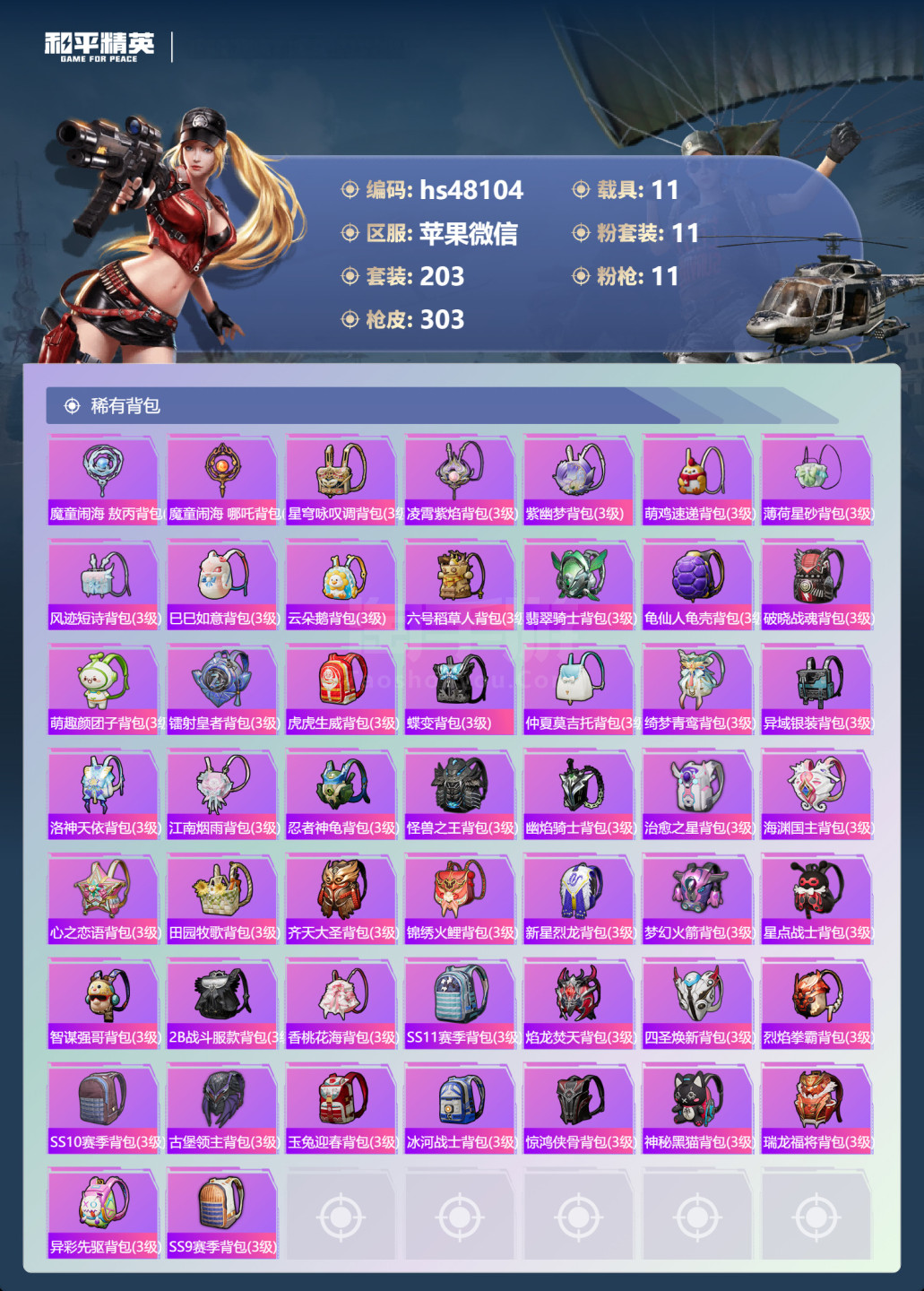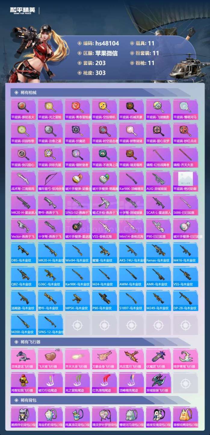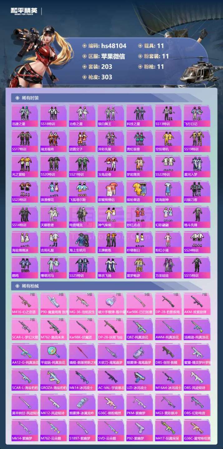hs48104 苹果微-24王牌印记-11粉装-11特效枪-11载具-126674热力值-203套