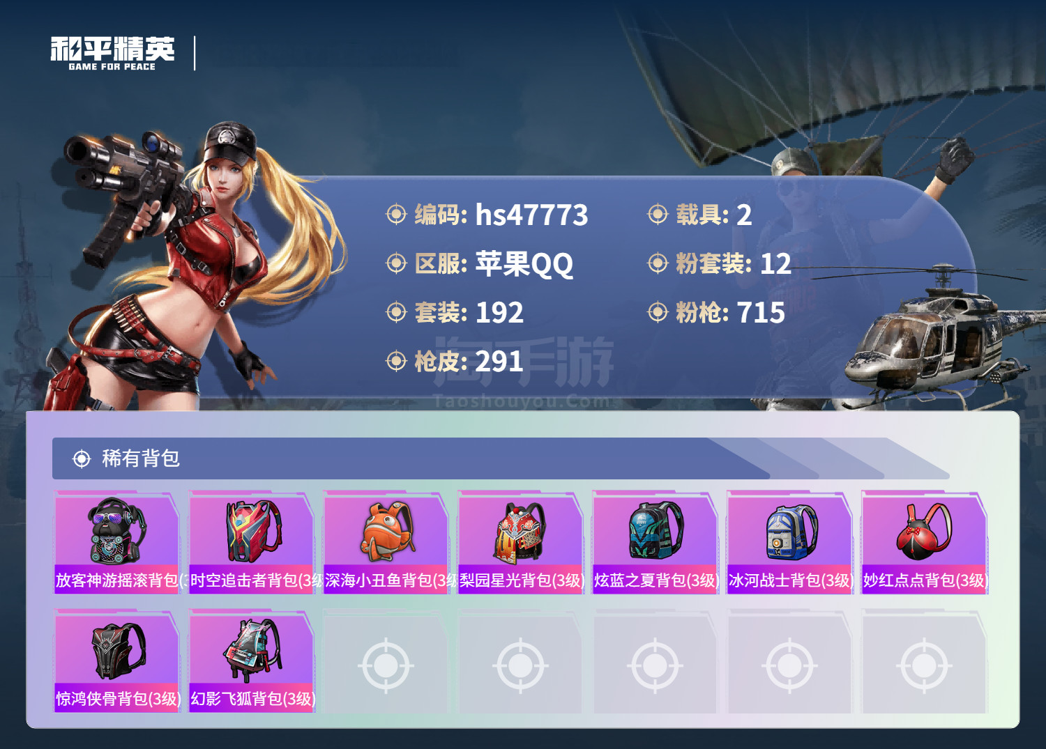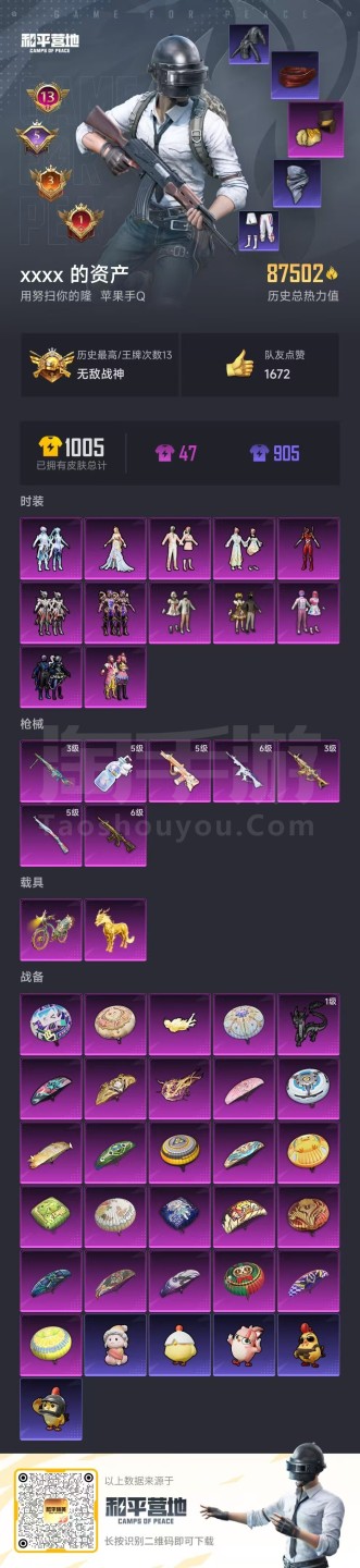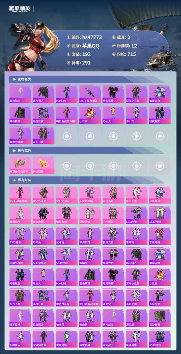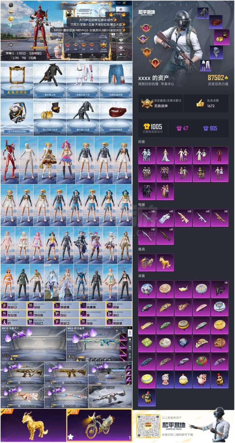 hs47773 苹果手Q-13王牌印记-有战神框-12粉装-7特效枪-2载具-87502热力值-19