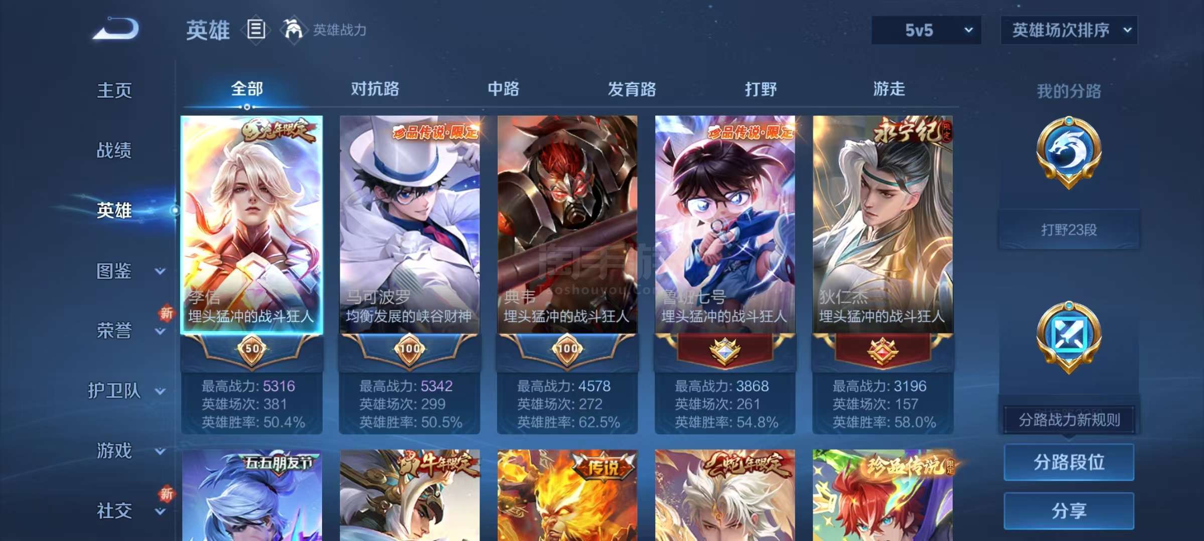 安卓v/至尊星耀/221皮肤/126英雄/1典藏/0珍品无双/0无双/3珍品传说/20传说/68史