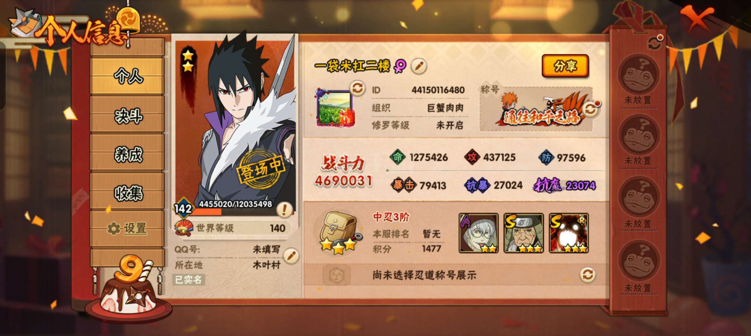 火影忍者【安卓QQ】V11火影账号,4忍法帖s,9个198A忍,2个忍法帖A,1个熊猫