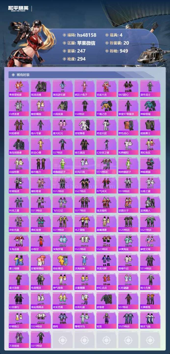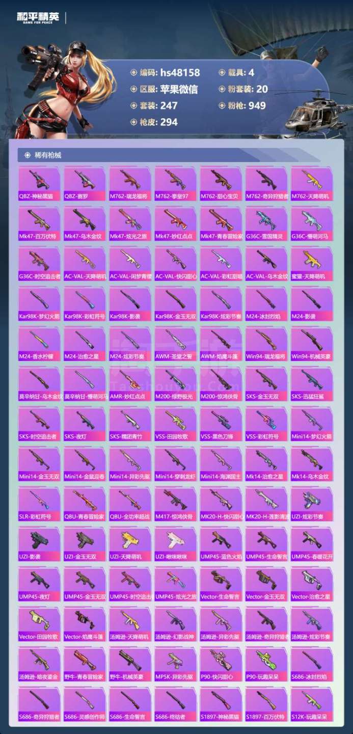 hs48158 苹果微-31王牌印记-有战神框-20粉装-17特效枪-4载具-123781热力值-