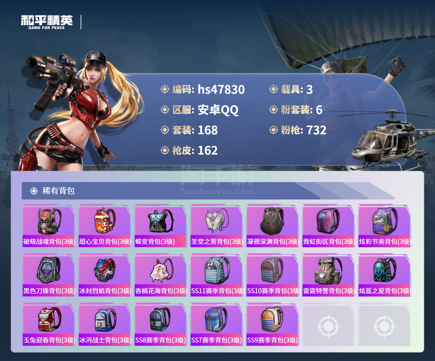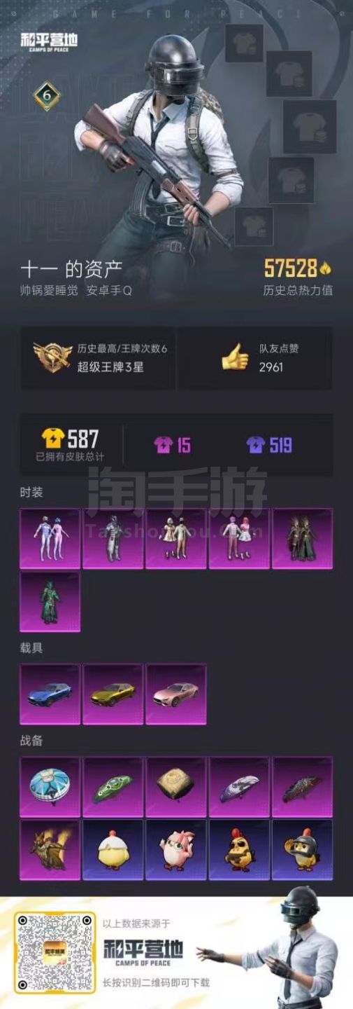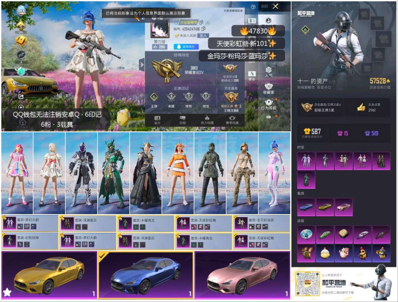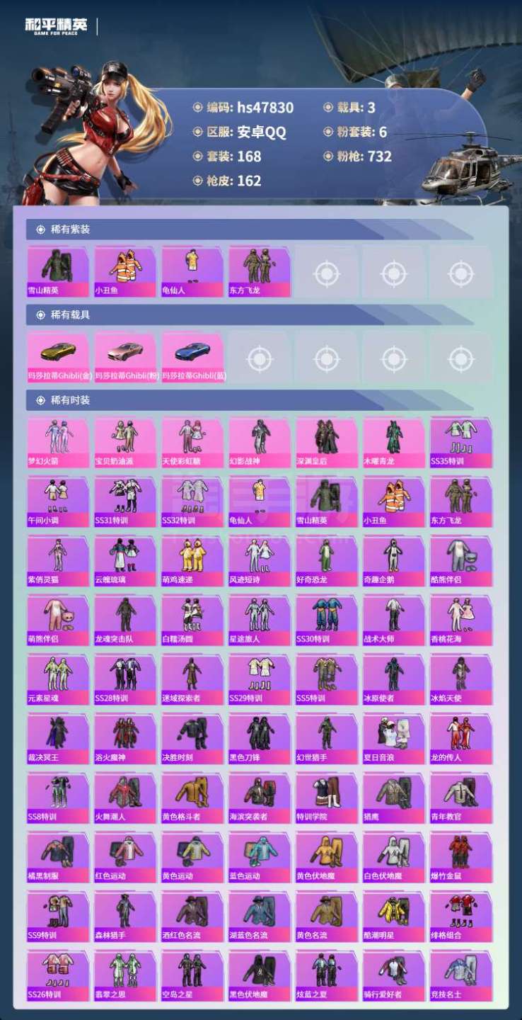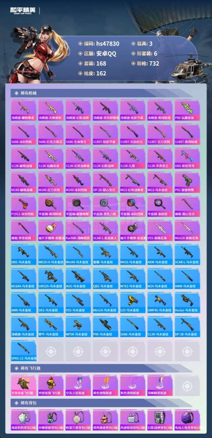 hs47830 安卓手Q-6王牌印记-6粉装-3载具-57598热力值-168套装-162枪皮 【