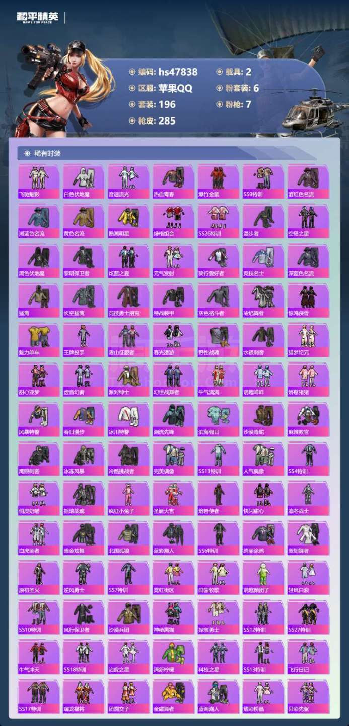 hs47838 苹果手Q-18王牌印记-6粉装-7特效枪-2载具-88725热力值-196套装-28