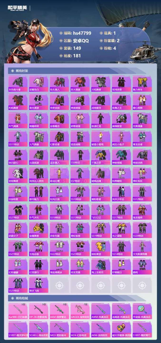 hs47799 安卓手Q-4王牌印记-2粉装-4特效枪-1载具-57648热力值-149套装-181
