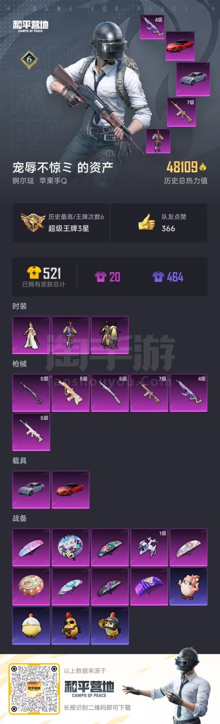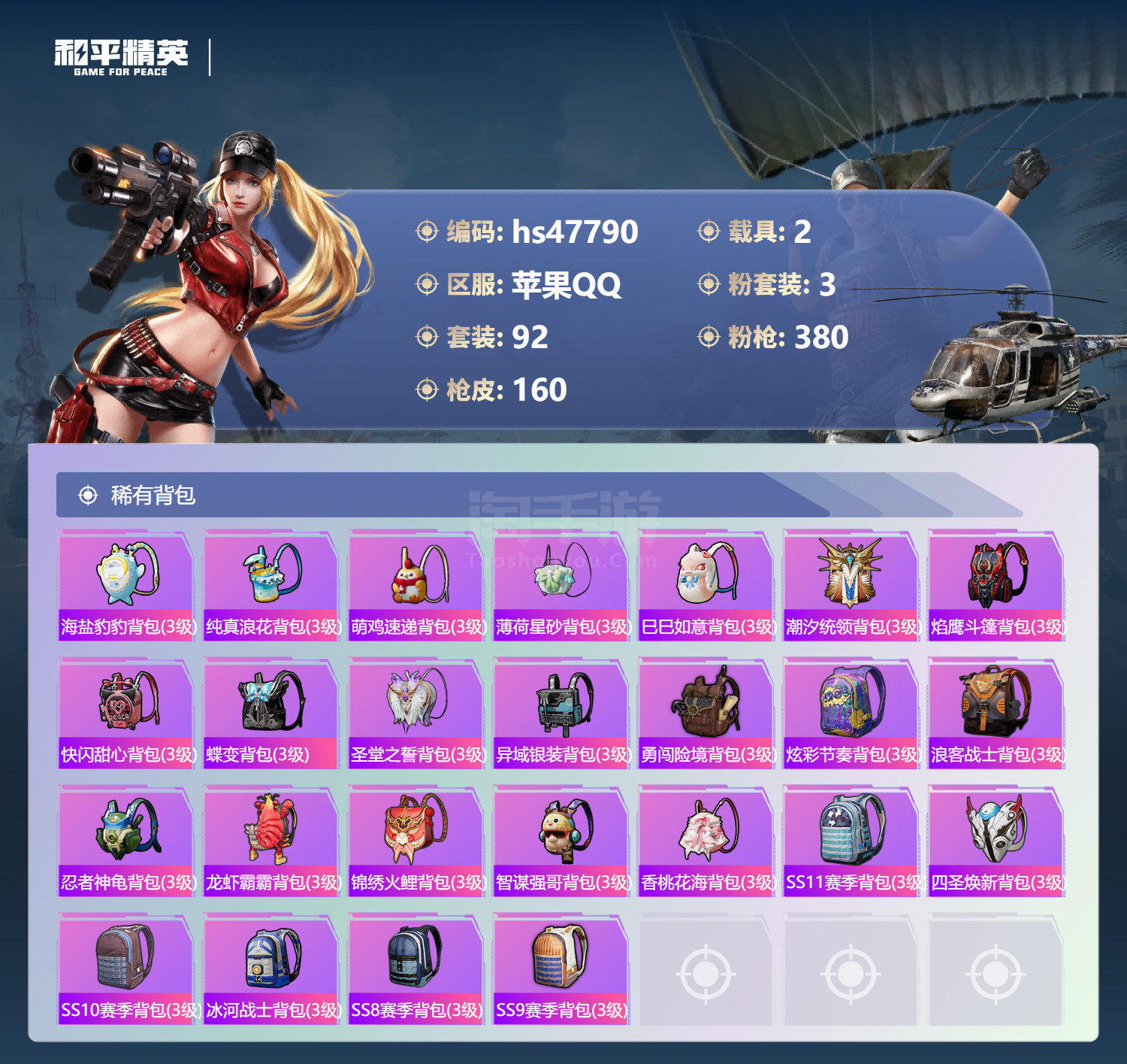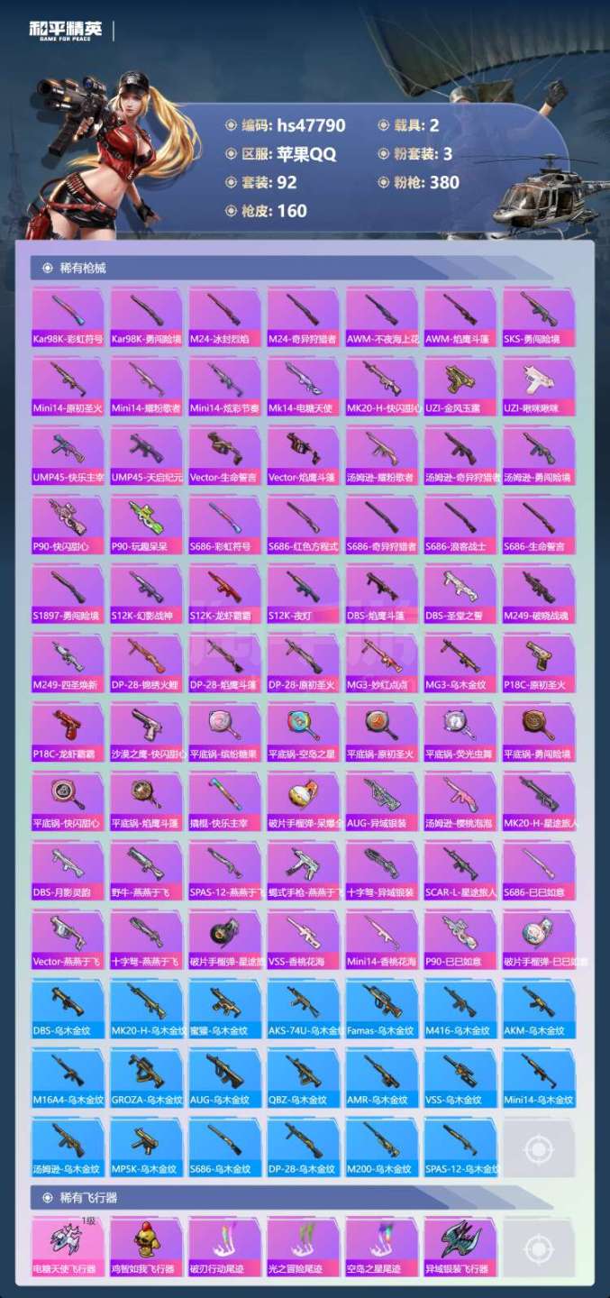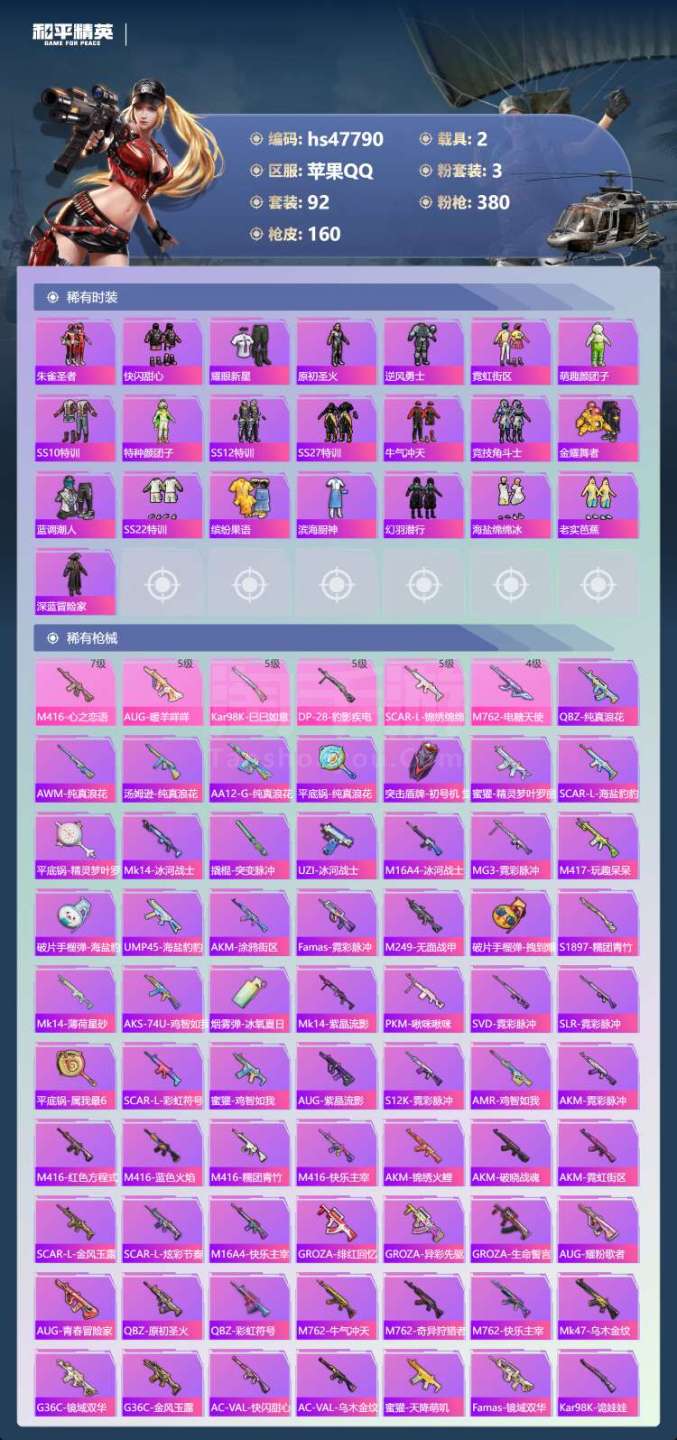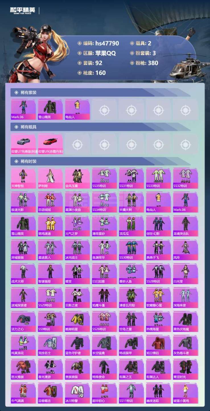 hs47790 苹果手Q-6王牌印记-3粉装-6特效枪-2载具-48109热力值-92套装-160枪