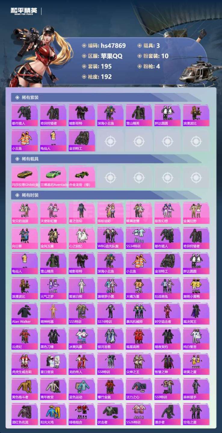 hs47869 苹果手Q-21王牌印记-有战神框-10粉装-4特效枪-3载具-73554热力值-19
