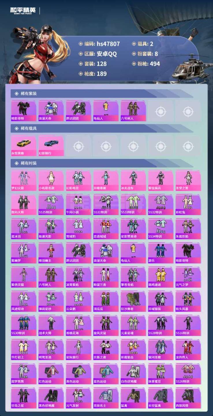 hs47807 安卓手Q-9王牌印记-8粉装-5特效枪-2载具-63612热力值-128套装-189